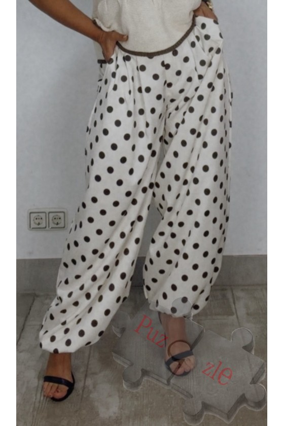 Pantalón en crudo con lunar en marrón , lleva bolsillos y goma en la parte trasera , disponible en talla única