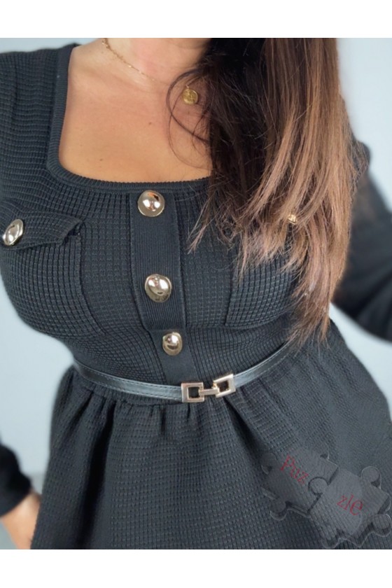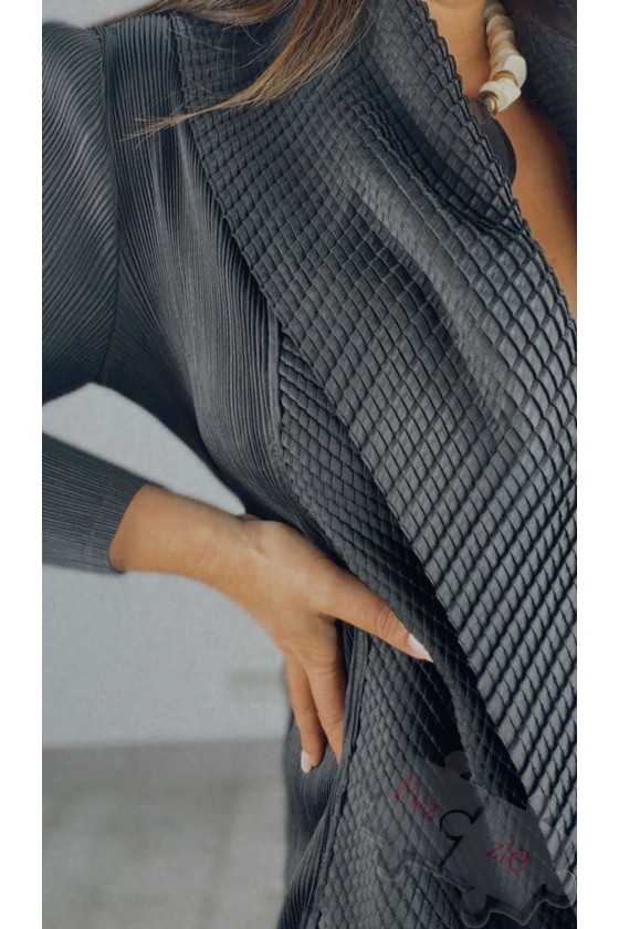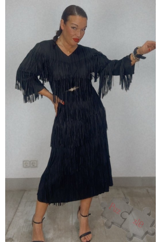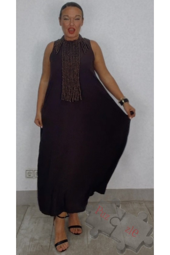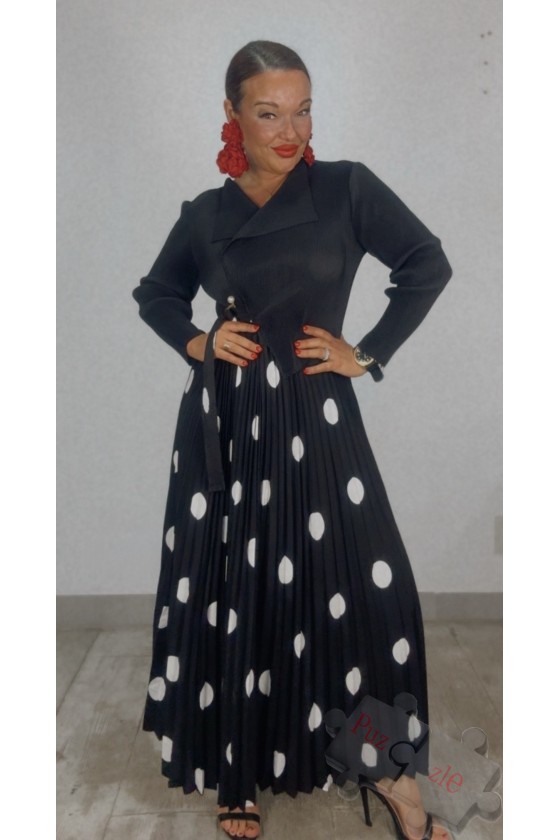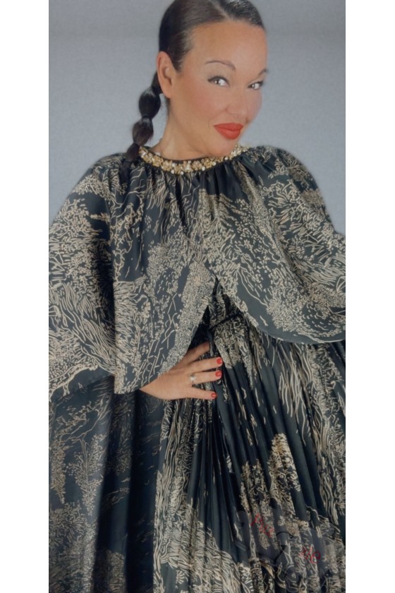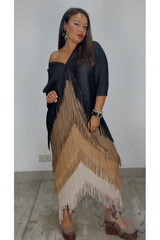 Vestido de tejido acordeón en tono negro con pinceladas en tono dorado, disponible en talla única que oscila desde la talla 38 a 54 sin problemas y sin marcar