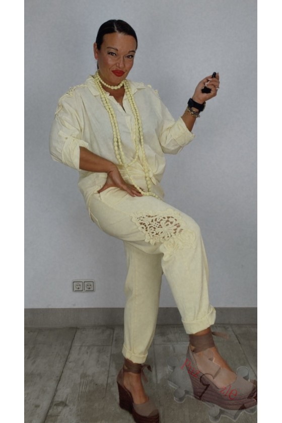 Pantalón tejano en tono amarillo con lunar chocolate , disponible en talla única