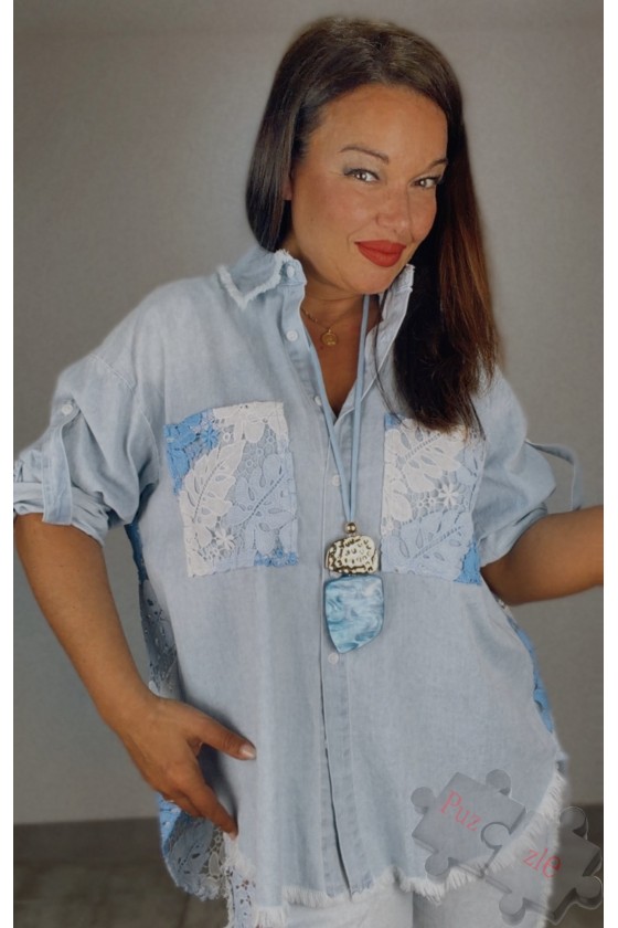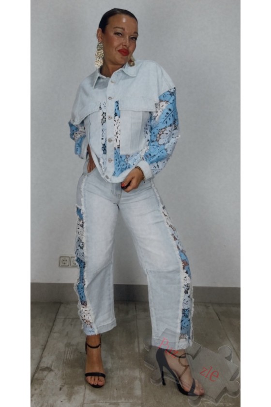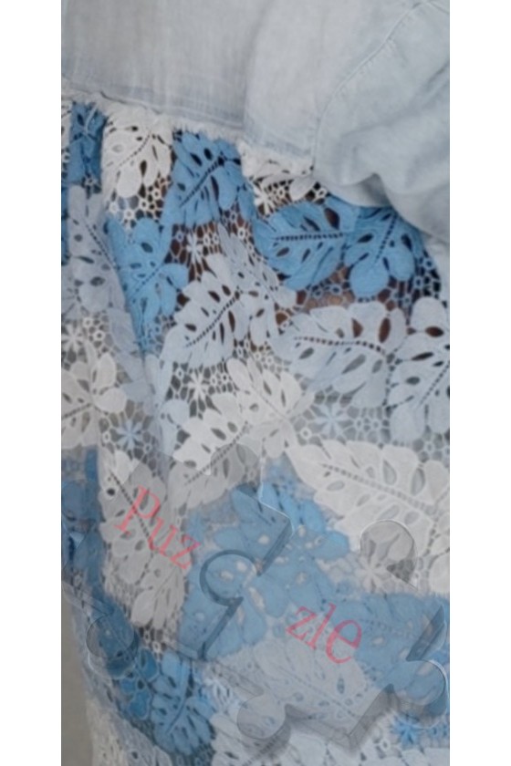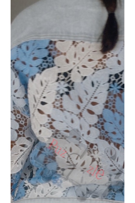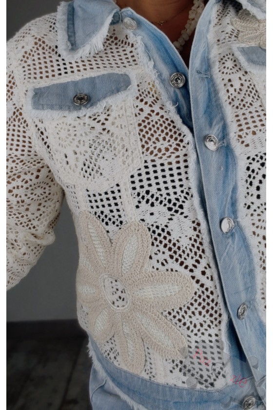 Chaqueta perforada con detalles en denim y crochet , disponible en tres tallas