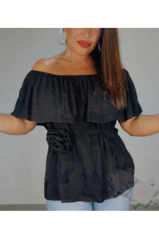 Gastos de envío por 4,95€. Envíos gratis en pedidos superiores a 69,90€. Camisa en tono negro con escote de barco con volante , incorpora cinturón flor, disponible en talla única