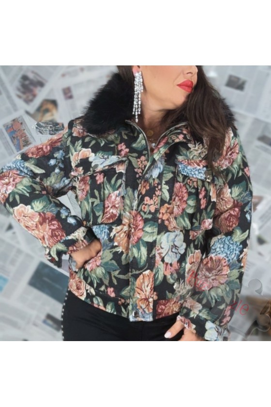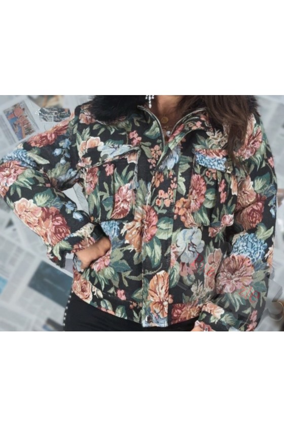 Bomber estampada con cuello desmontable y va enguatada por dentro , disponible en tres tallas
