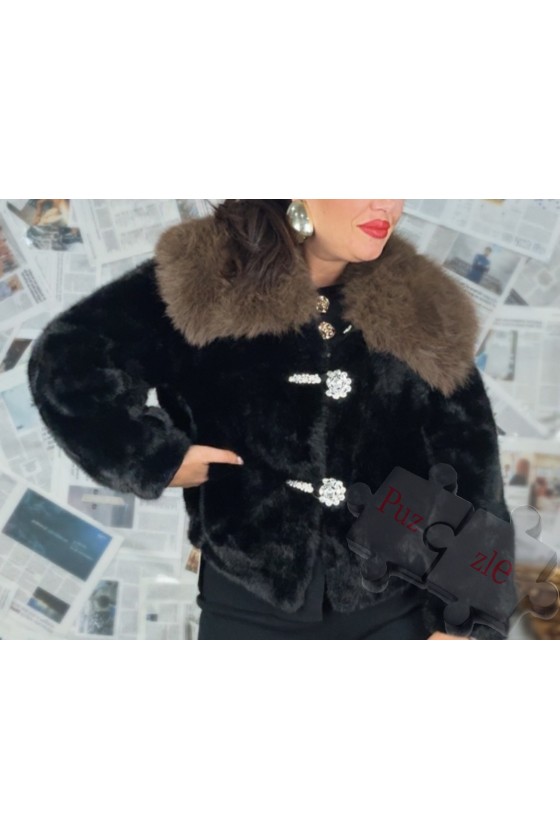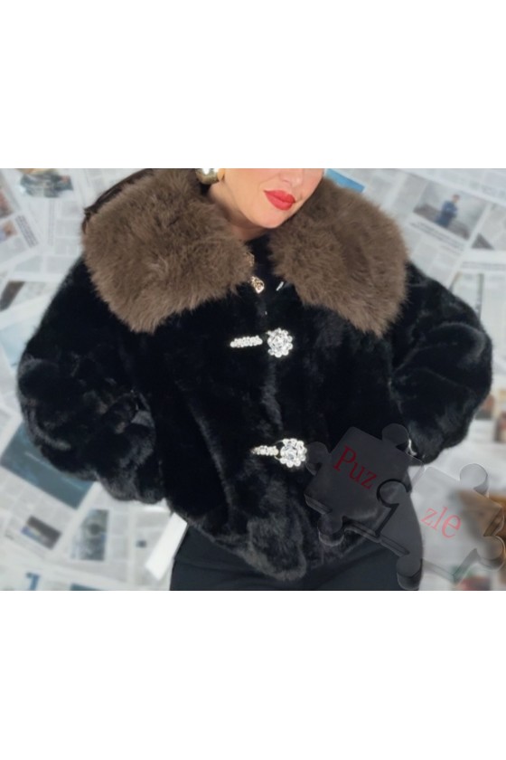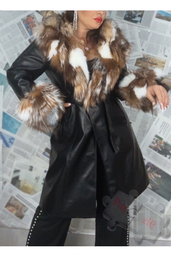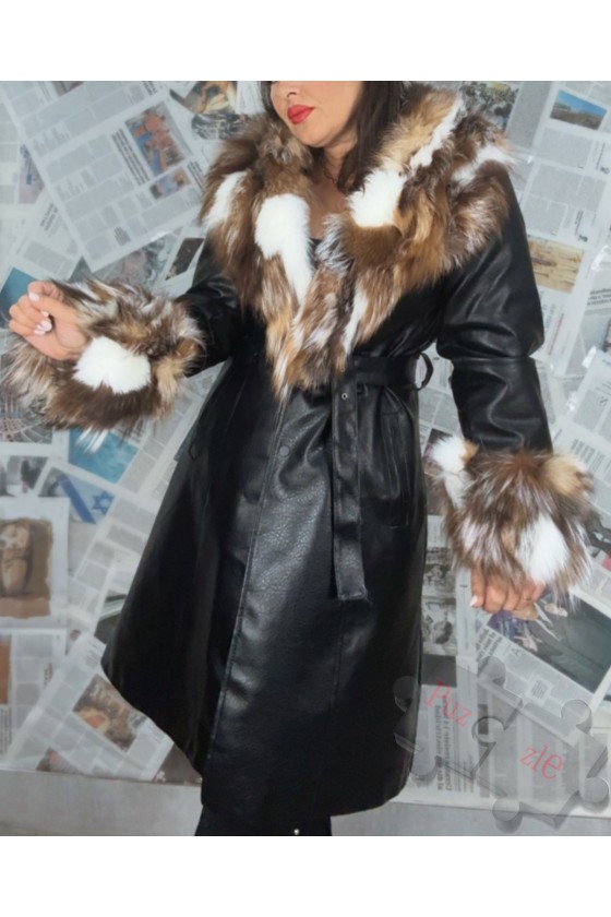 Abrigo de polipiel en tono negro con cuello y puños de pelo natural de zorro , disponible en talla única