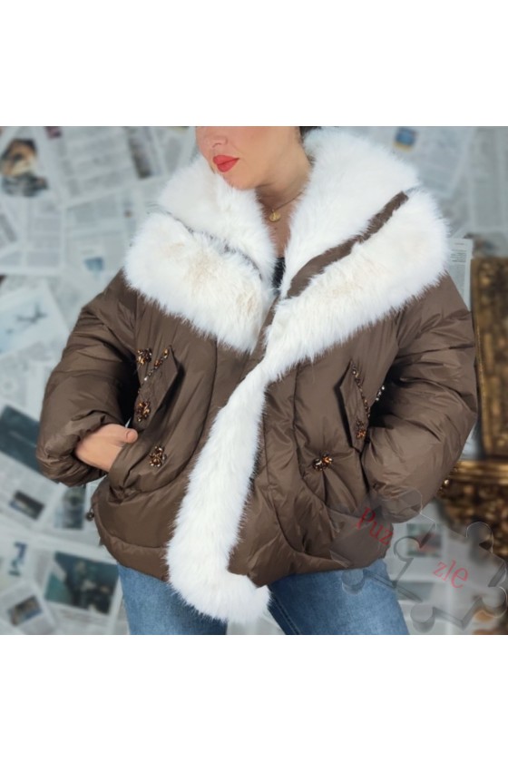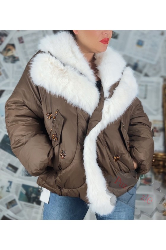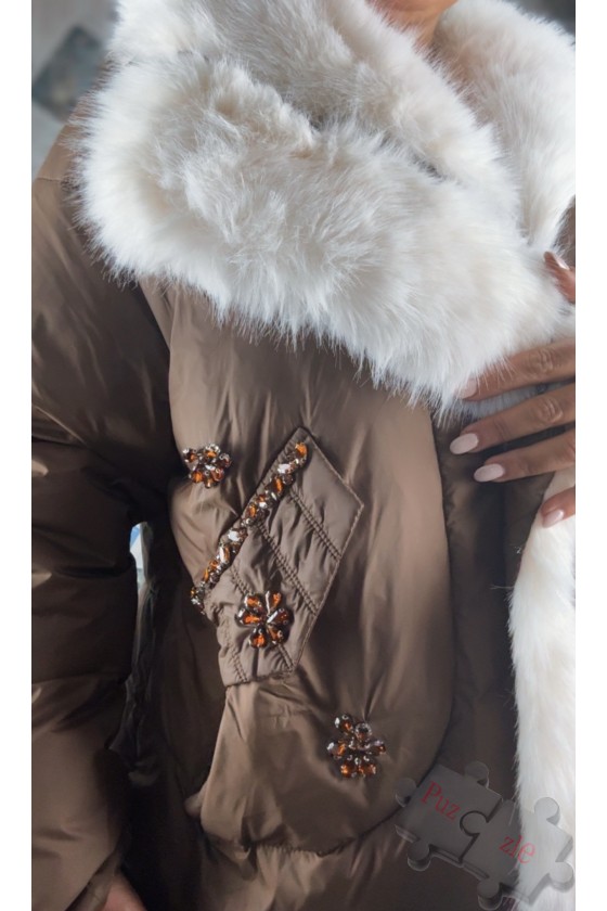 Abrigo en tono marrón con pelo en crudo y strass , relleno de pluma natural de oca, disponible en talla única