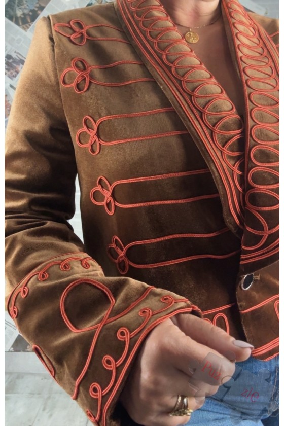 Chaqueta de terciopelo en tono chocolate con adorno en naranja , disponible en tres tallas