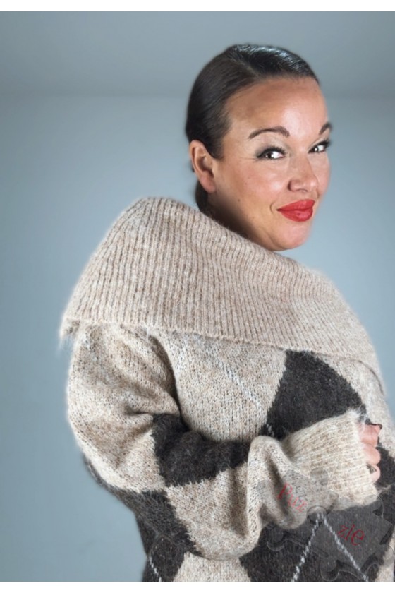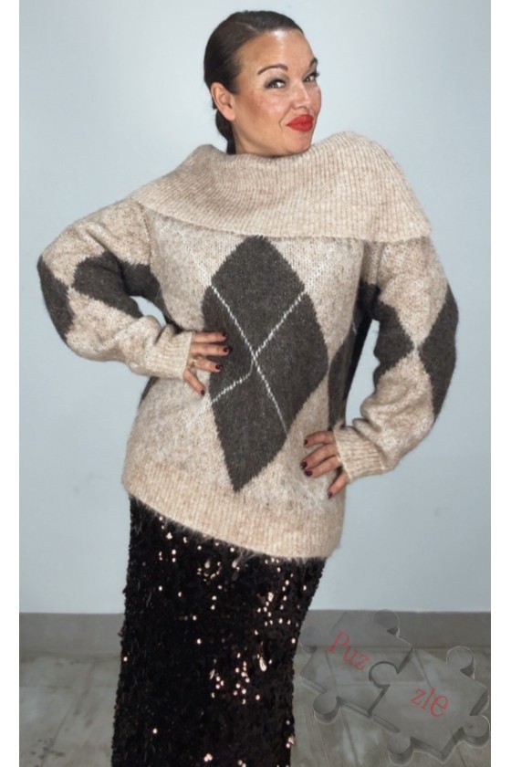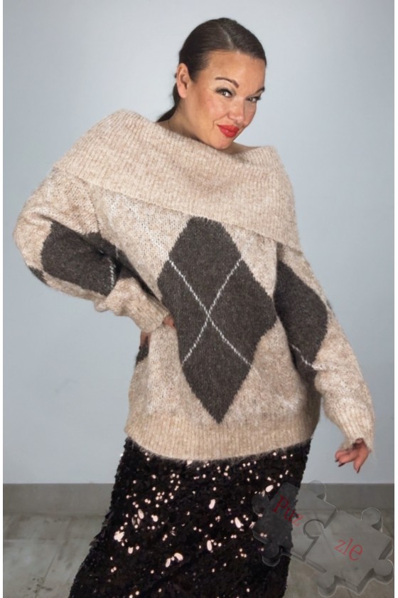 Suéter de lana con escote barco en tono crudo con rombos en marrón , disponible en talla única