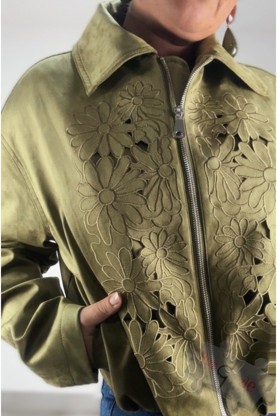 Bomber de antelina en tono verde con perforado delantero , disponible en talla única