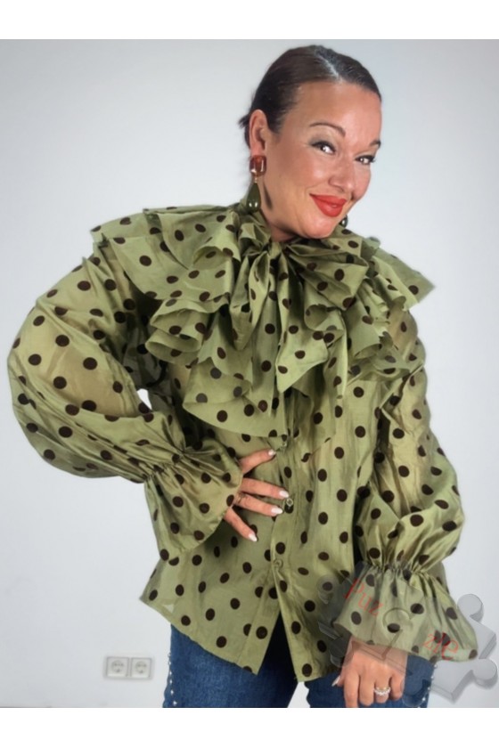 Camisa de gasa en tono verde con lunar en tono marrón , disponible en talla única