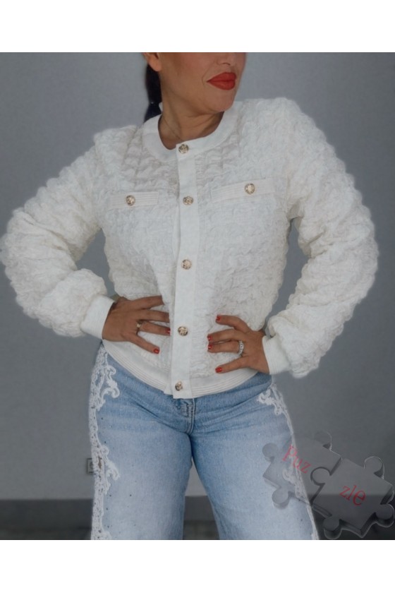 Chaqueta en tono blanco de crepé con mangas y bajos en encaje negro , disponible en talla unica