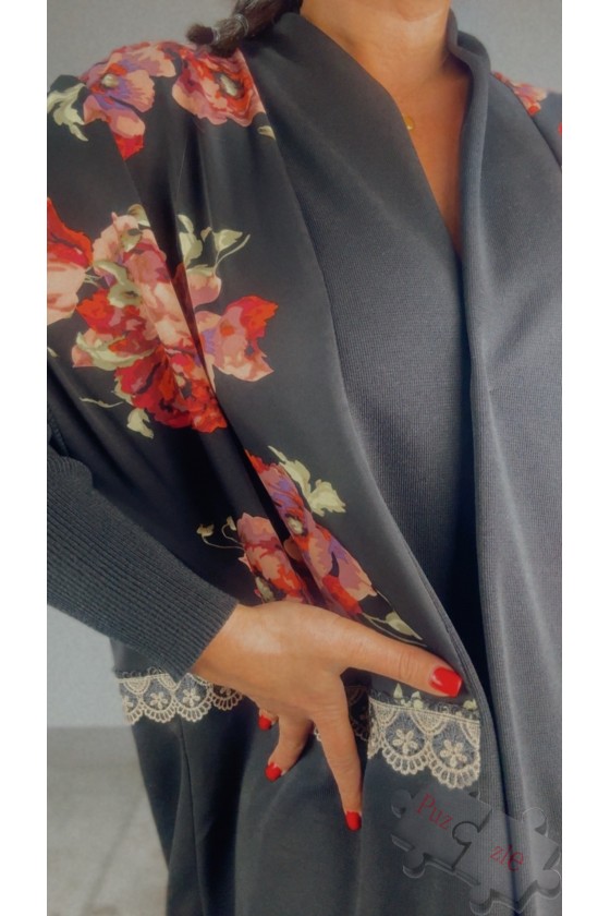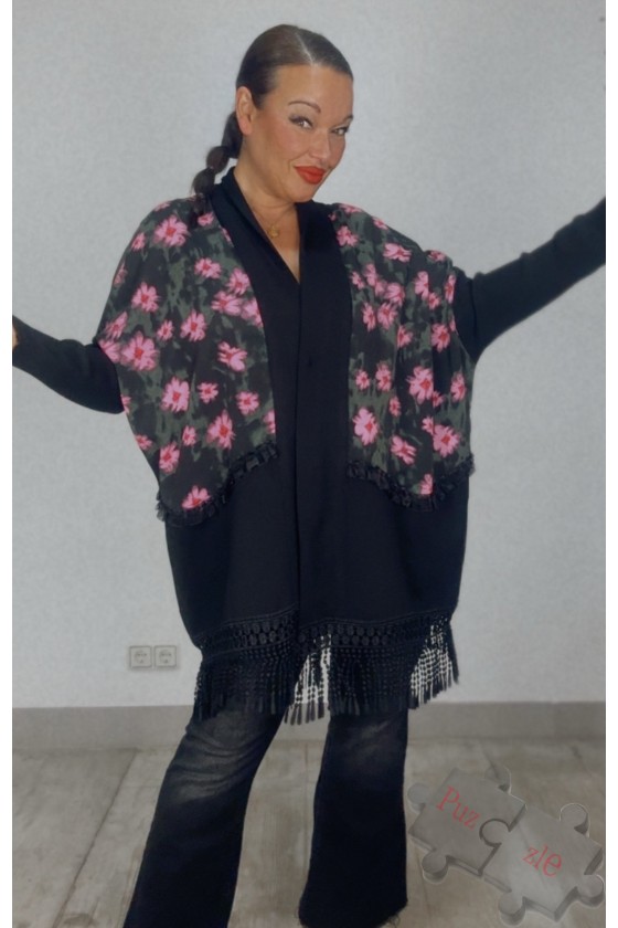 Chaqueta de crepé en tono negro con flores superpuestas en rojo , disponible en talla única