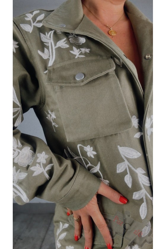 Parka en tono verde militar bordada en tono crudo , disponible en tallas: