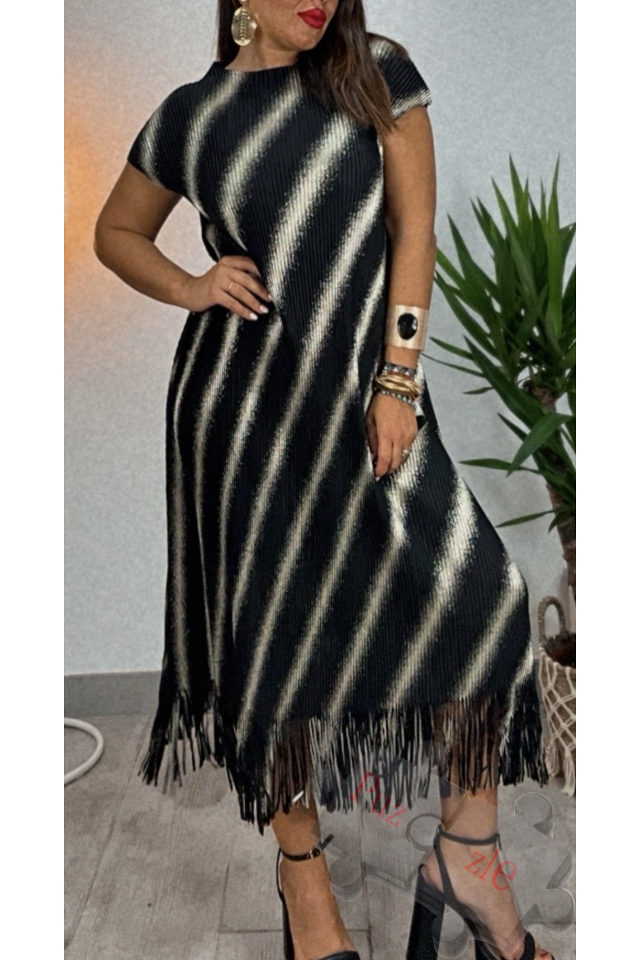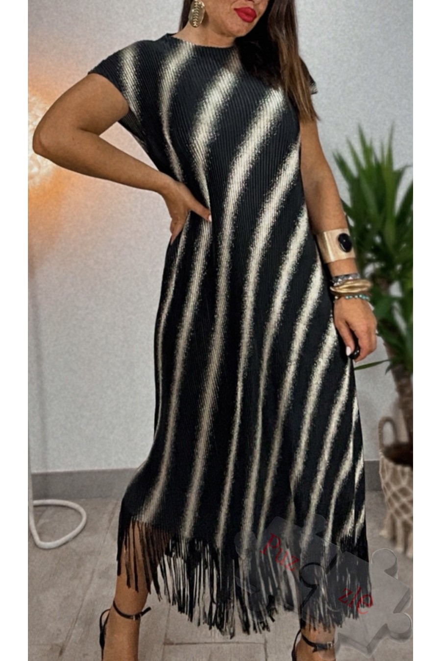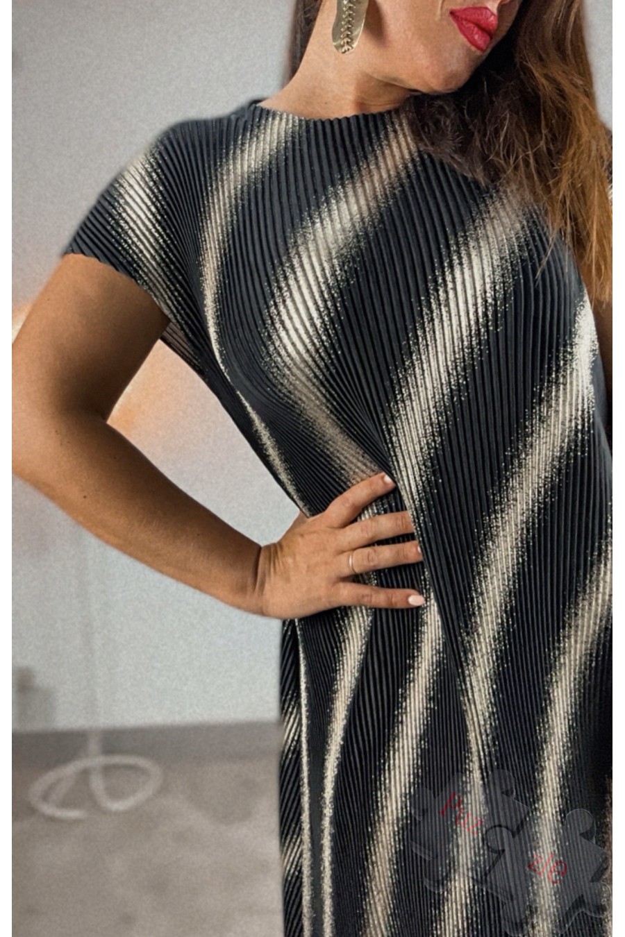 Vestido de tejido acordeón en tono negro con pinceladas en tono dorado, disponible en talla única que oscila desde la talla 38 a 54 sin problemas y sin marcar