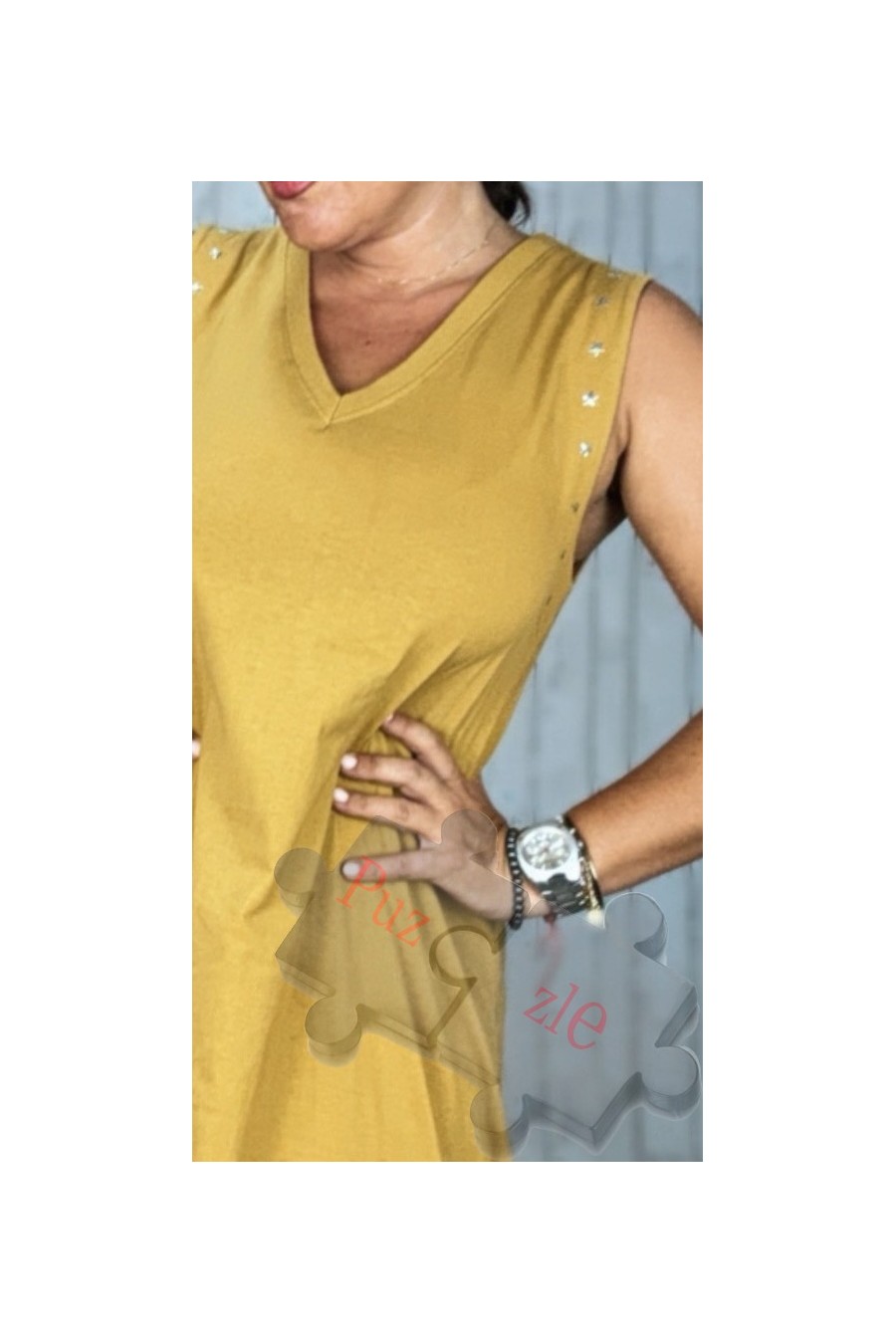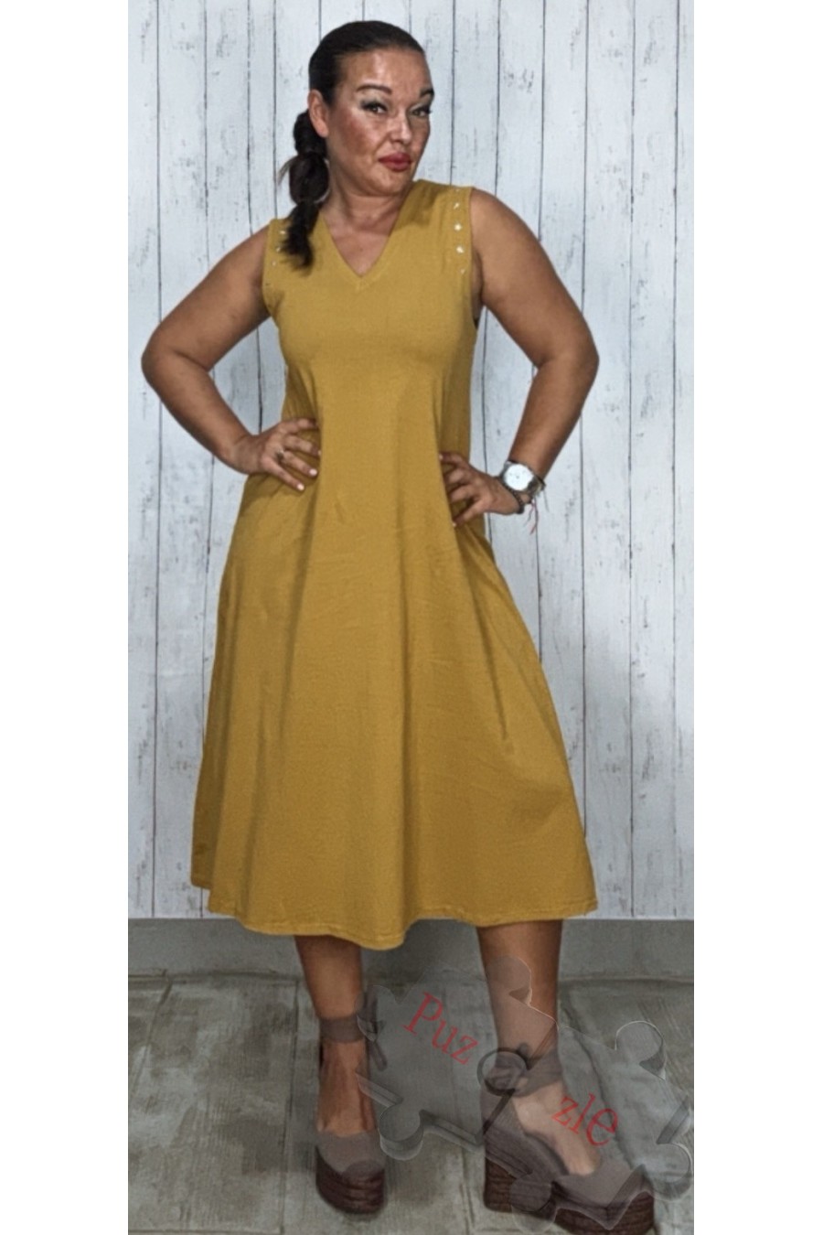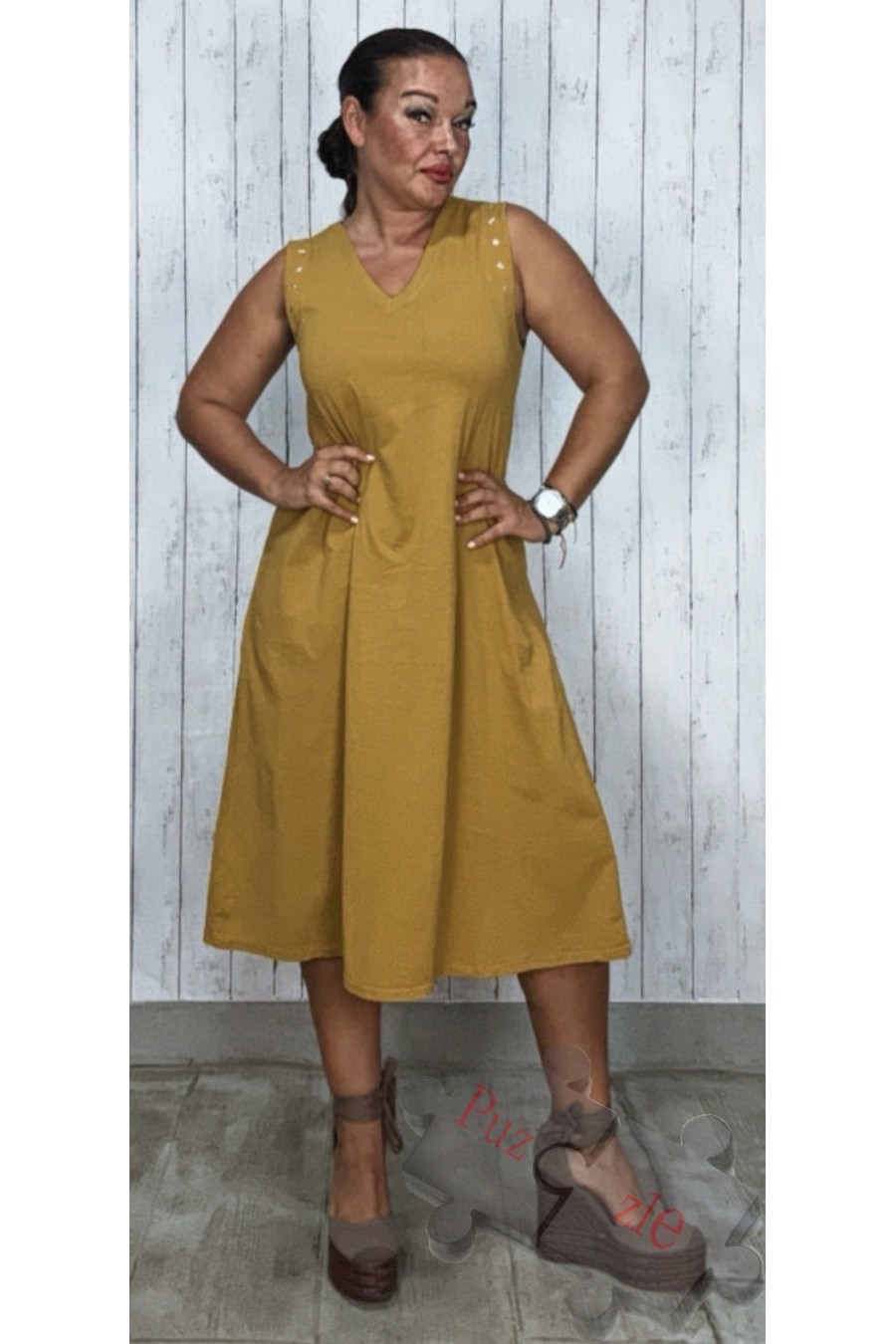 Vestido de algodón en color mostaza con estrellas en sisa , disponible en talla única