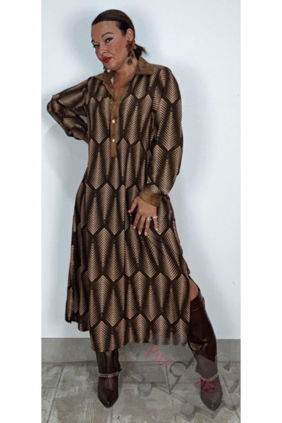 Vestido estampado, con cuello y puños en ante , disponible en talla única