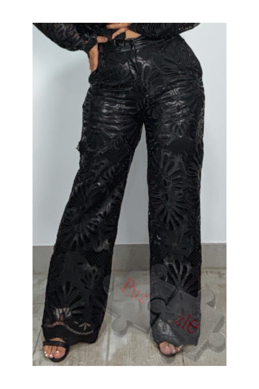 Pantalón de guipur bordado en polipiel , disponible en tres tallas