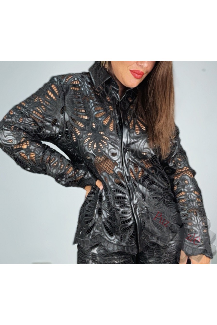 Camisa en guipur con bordado en polipiel , disponible en tres tallas