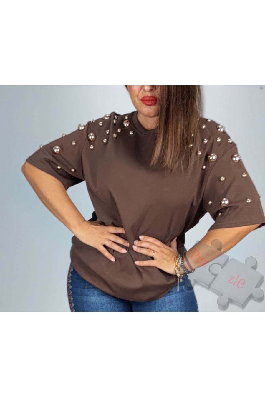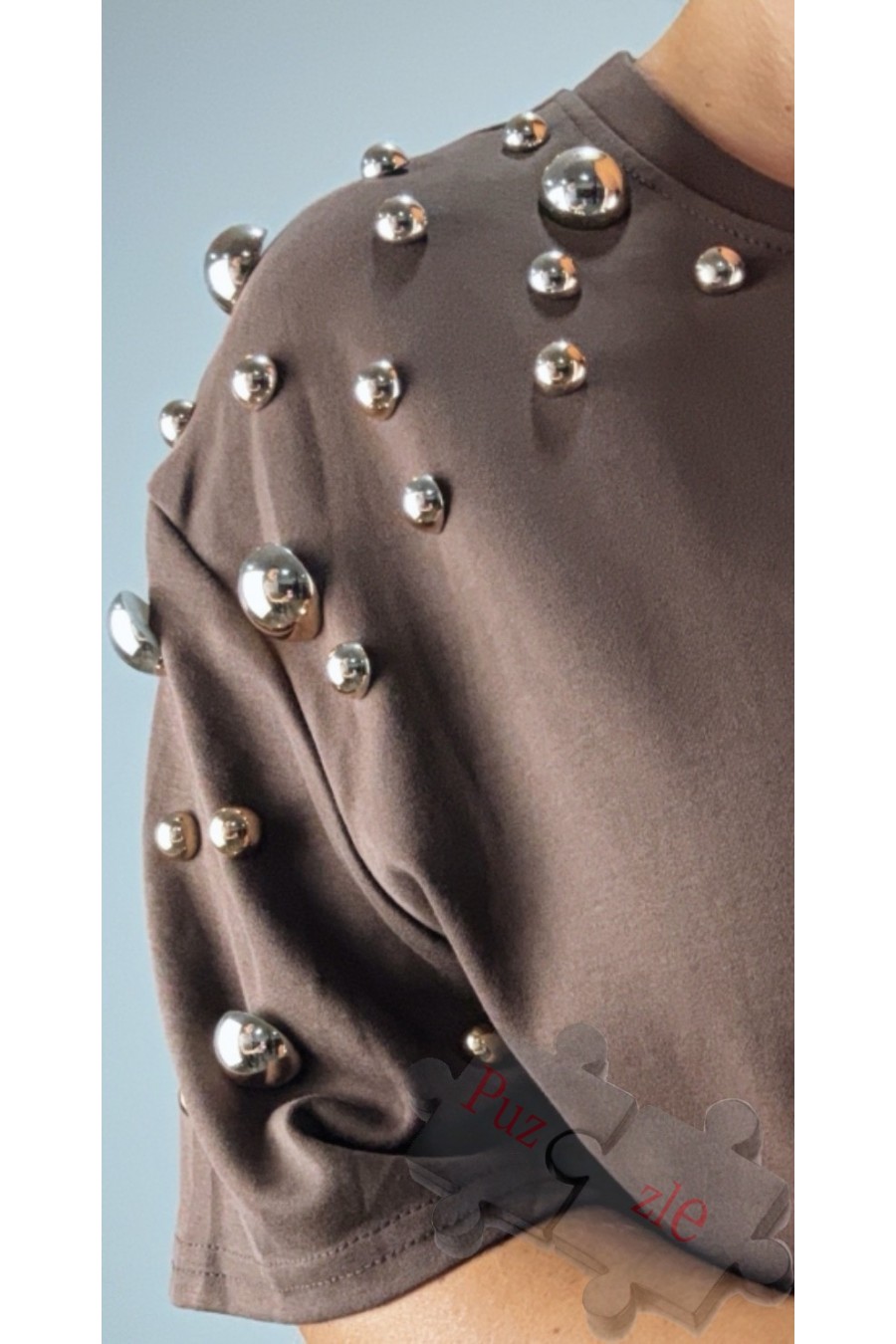 Camiseta en tono marrón con tachas doradas , disponible en talla única