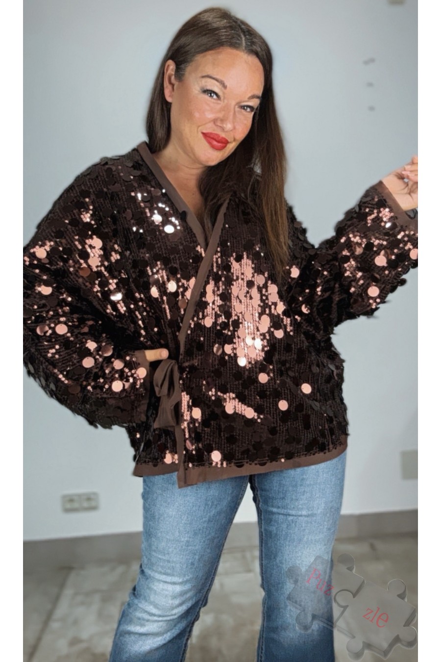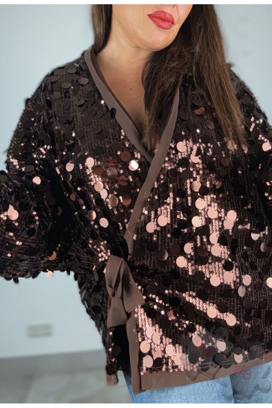 Camisa cruzada de lentejuelas chocolate , disponible en talla única