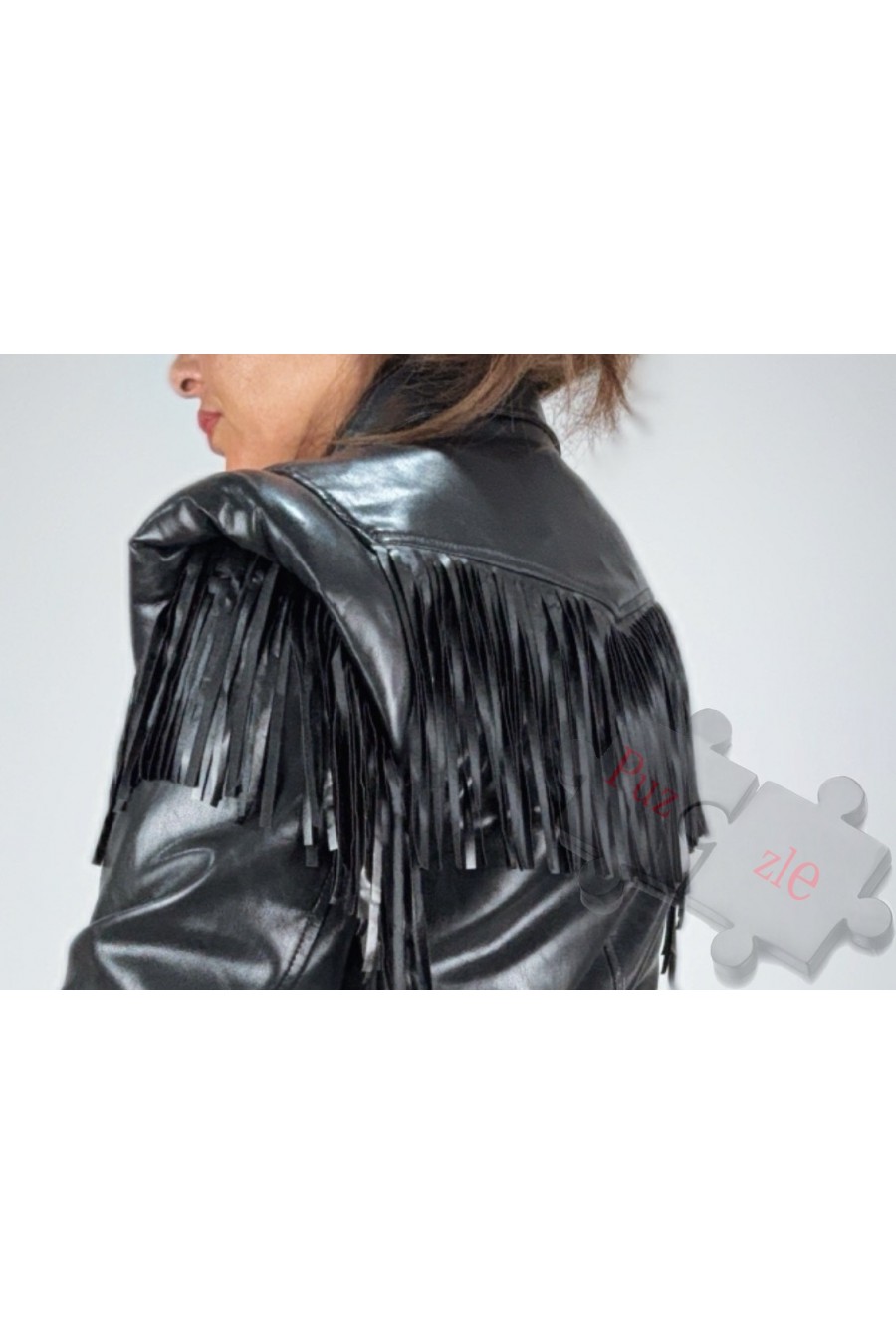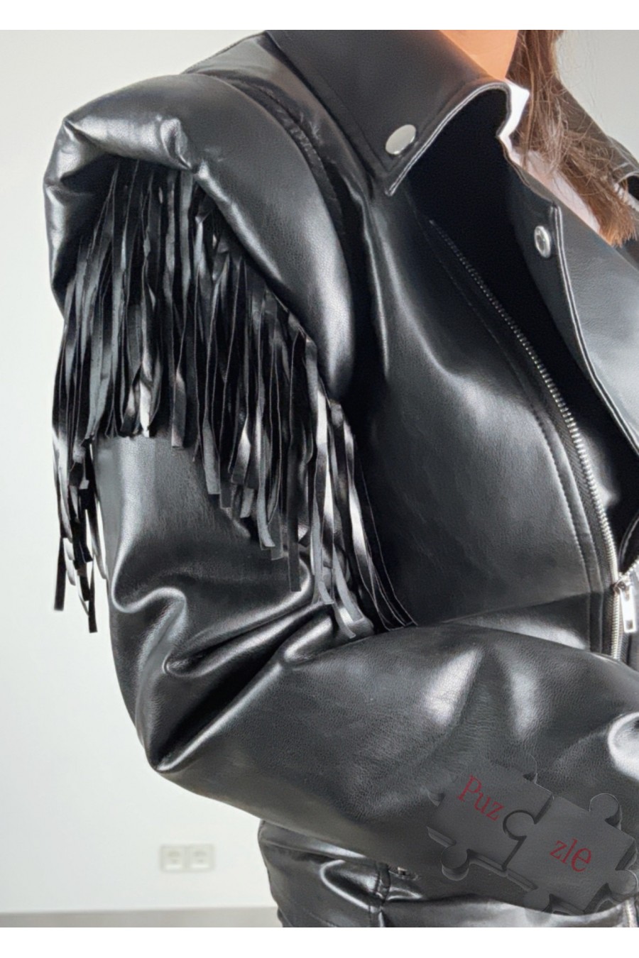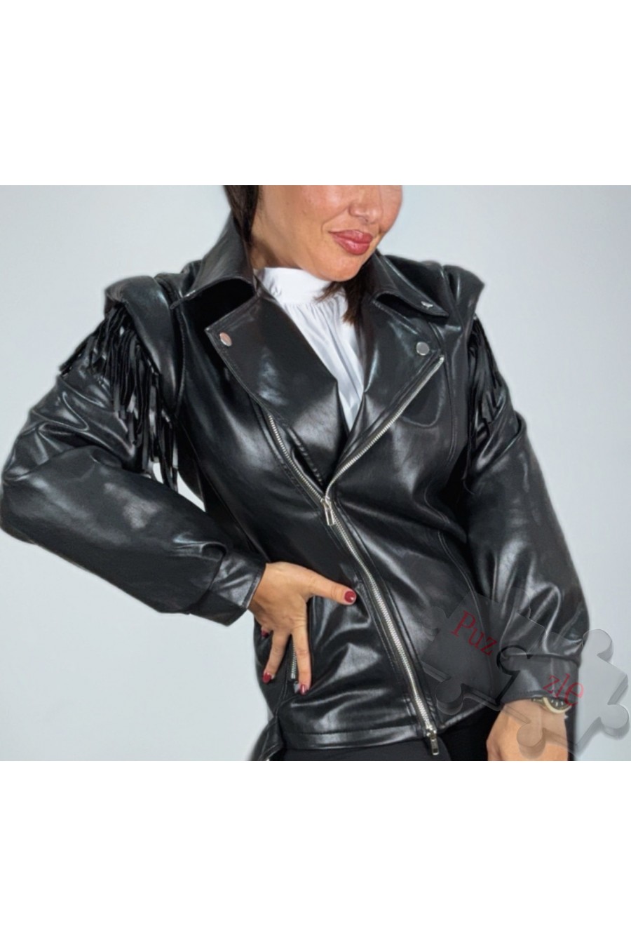 Chaqueta de polipiel con flecos en mangas y espalda , disponible en tres tallas