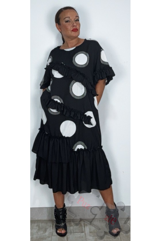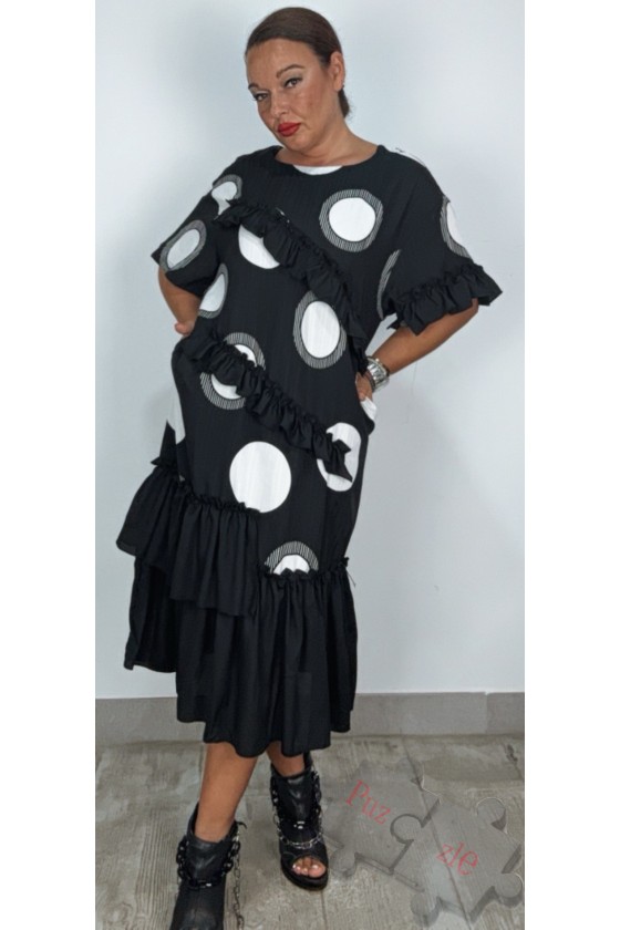 Vestido de tejido acordeón en tono negro con pinceladas en tono dorado, disponible en talla única que oscila desde la talla 38 a 54 sin problemas y sin marcar