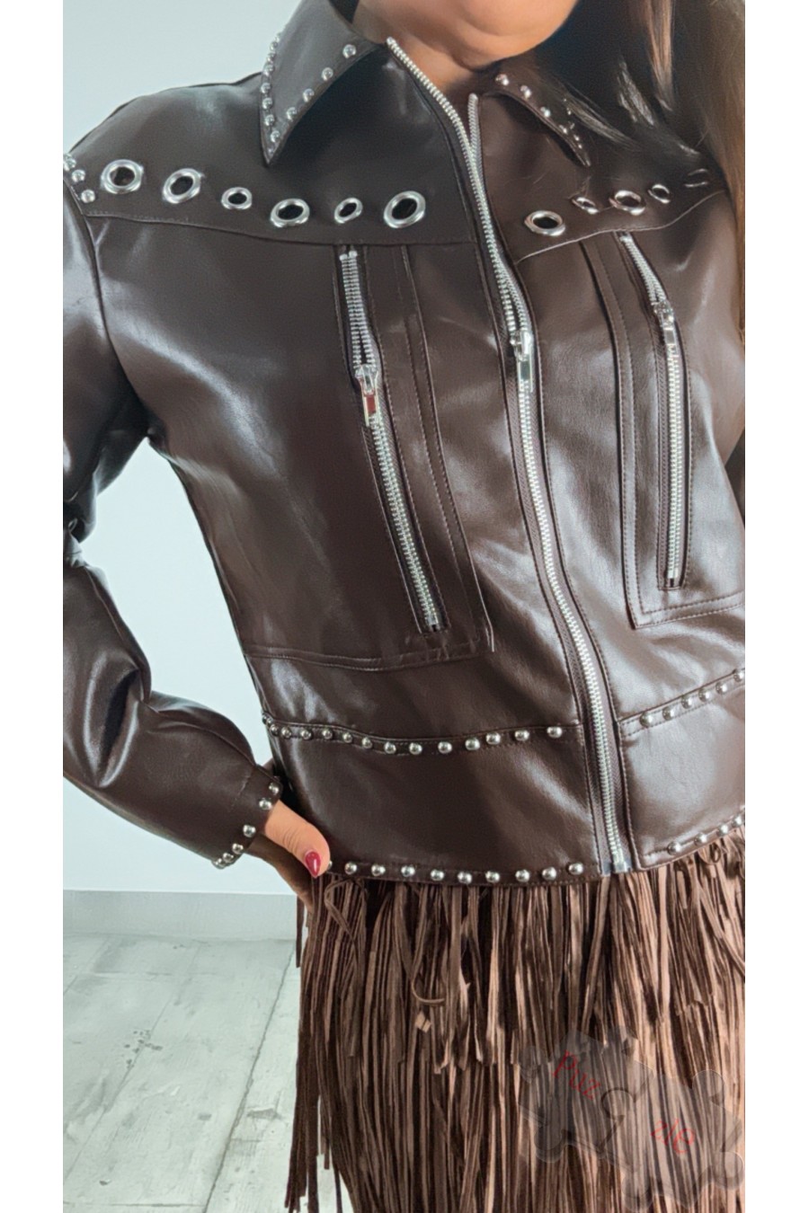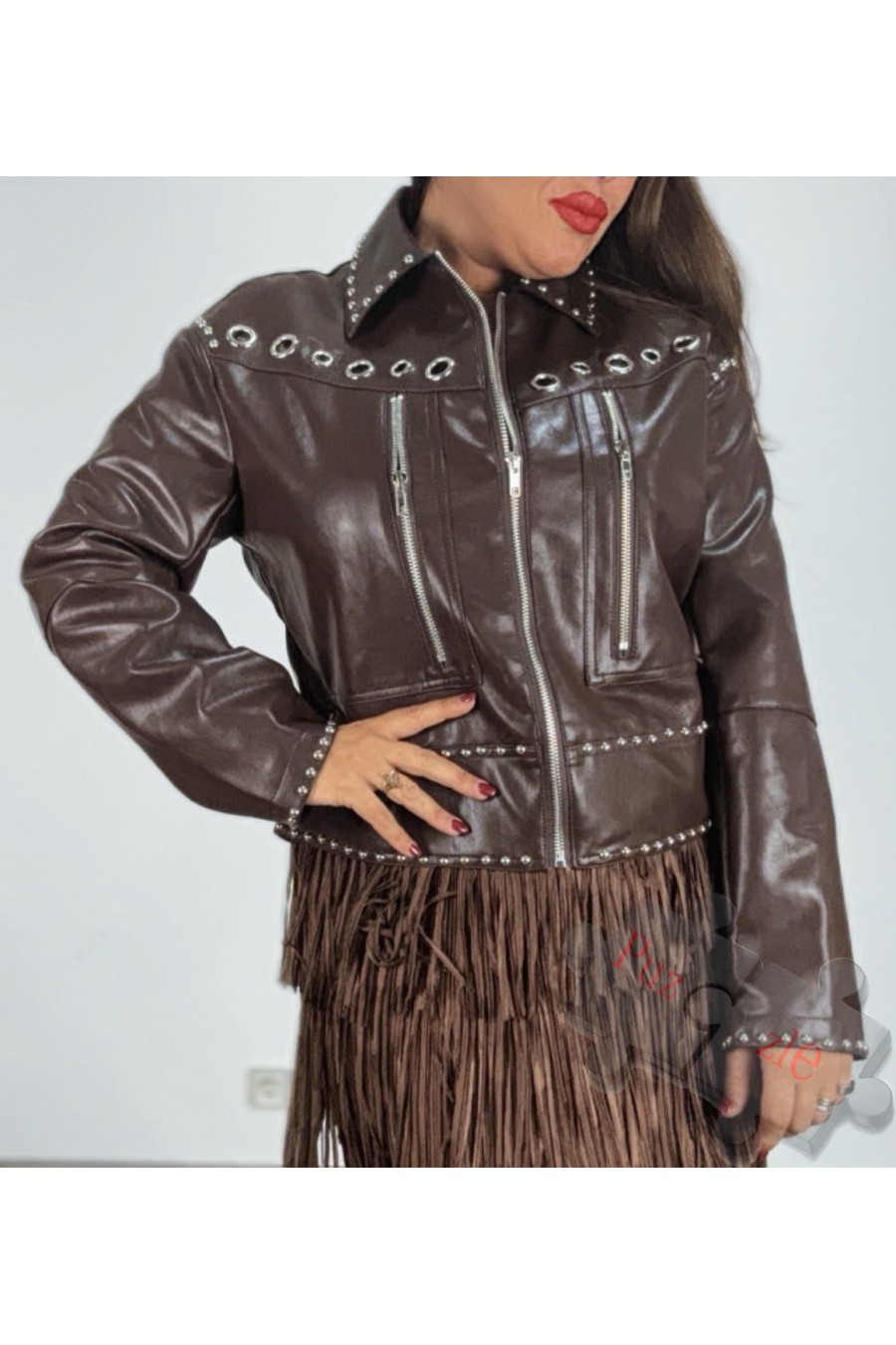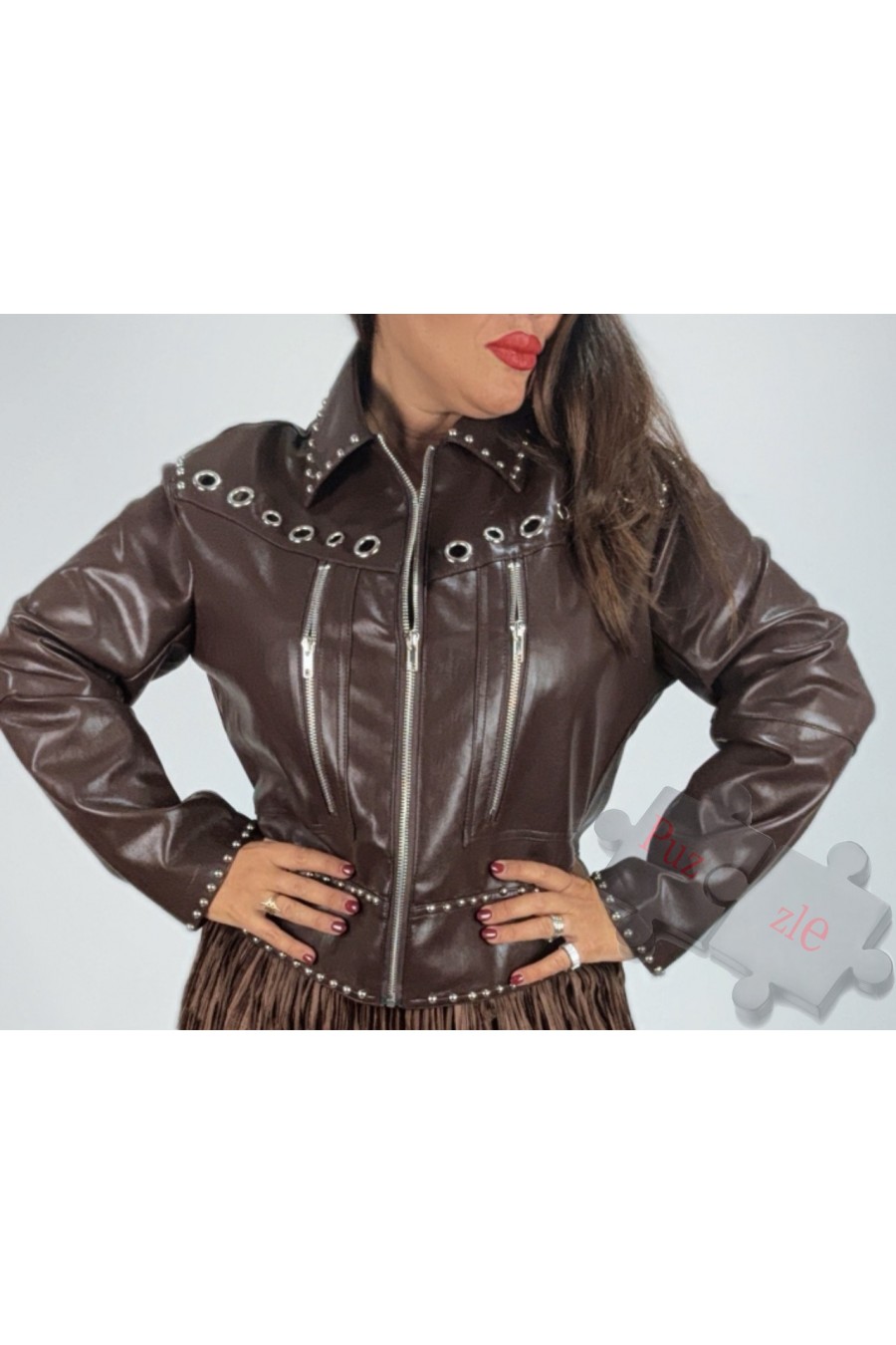 Chaqueta de polipiel en tono marrón con arandelas , disponible en tres tallas