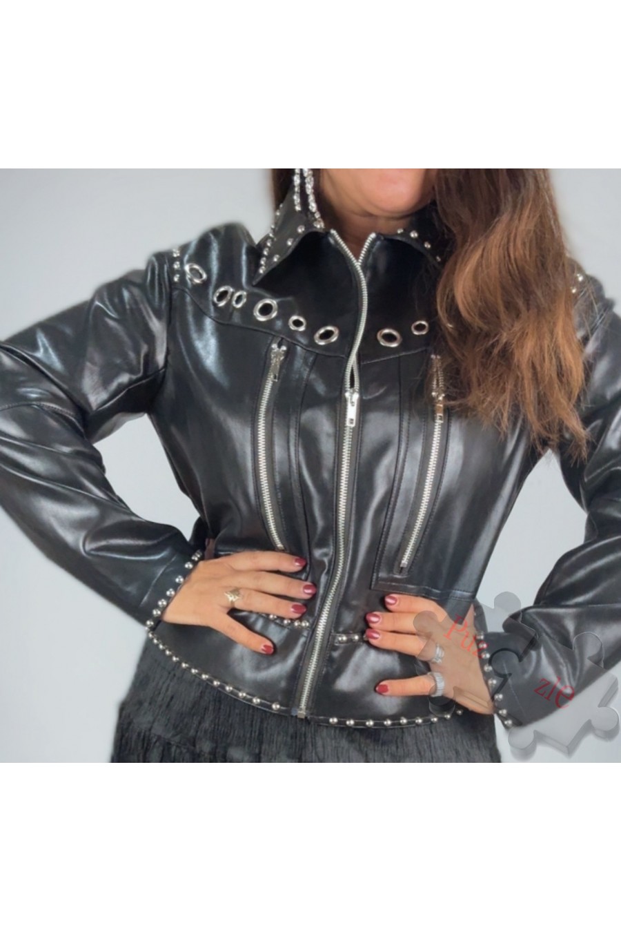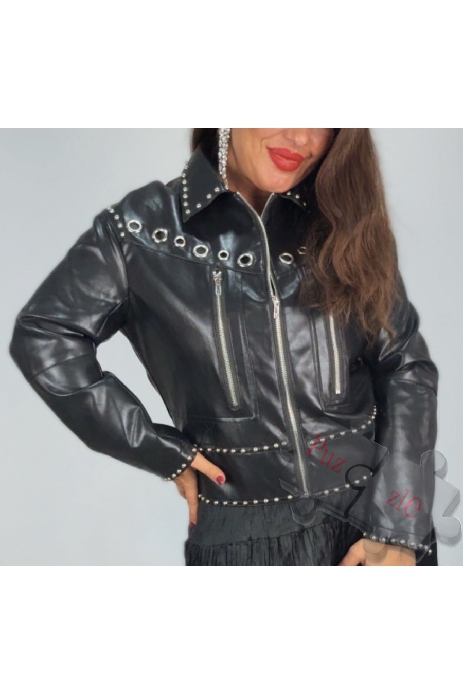 Chaqueta de polipiel en tono negro con tachas, disponible en tres tallas