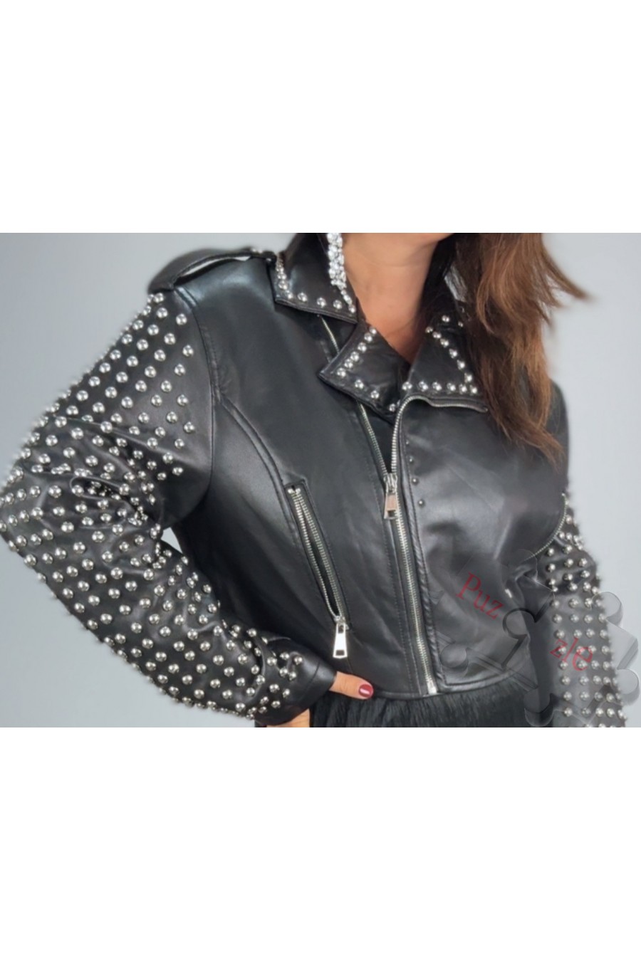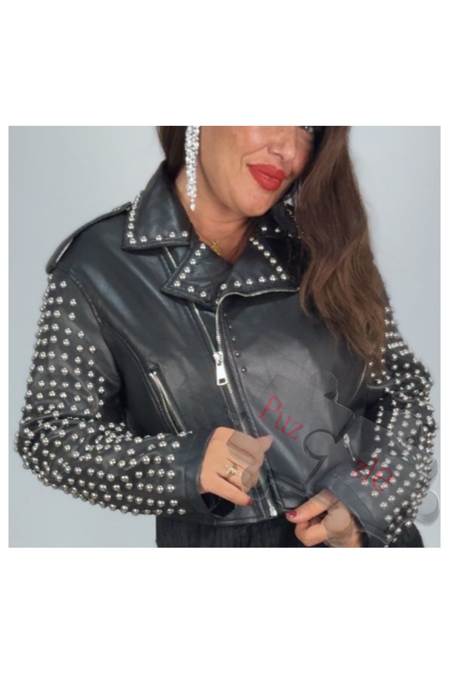Chaqueta en negro con tachas en mangas, disponible en talla