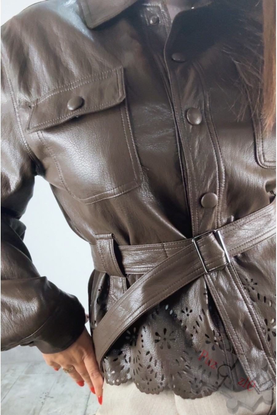 Chaqueta de polipiel en tono marrón con perforado en el bajo , disponible en talla única