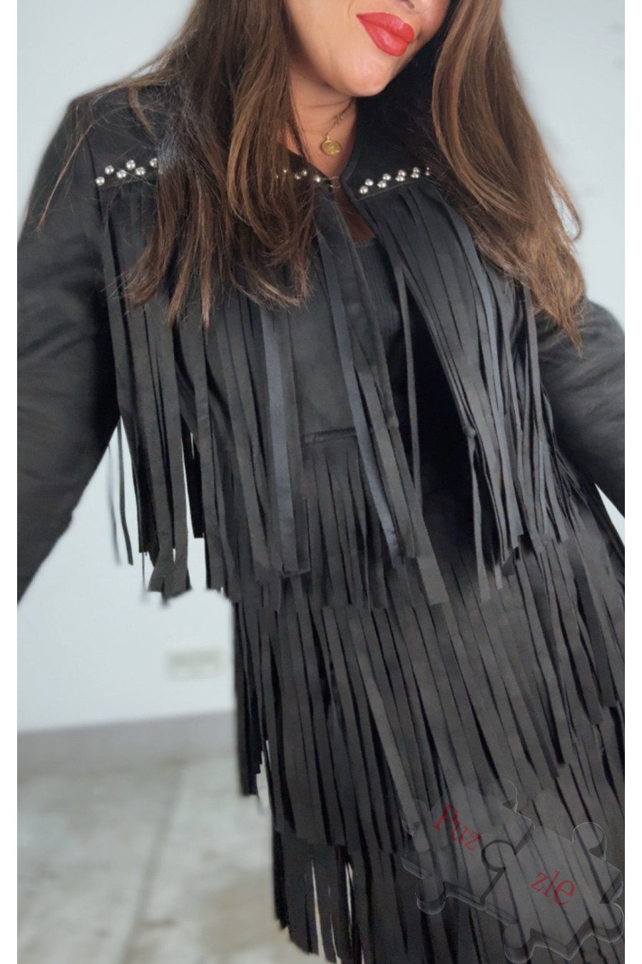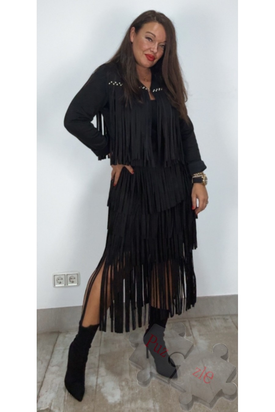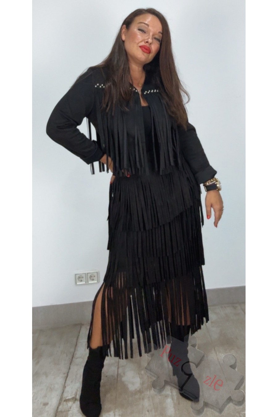 Conjunto de antelina en tono negro con flecos , disponible en talla única
