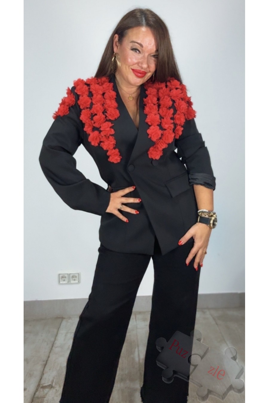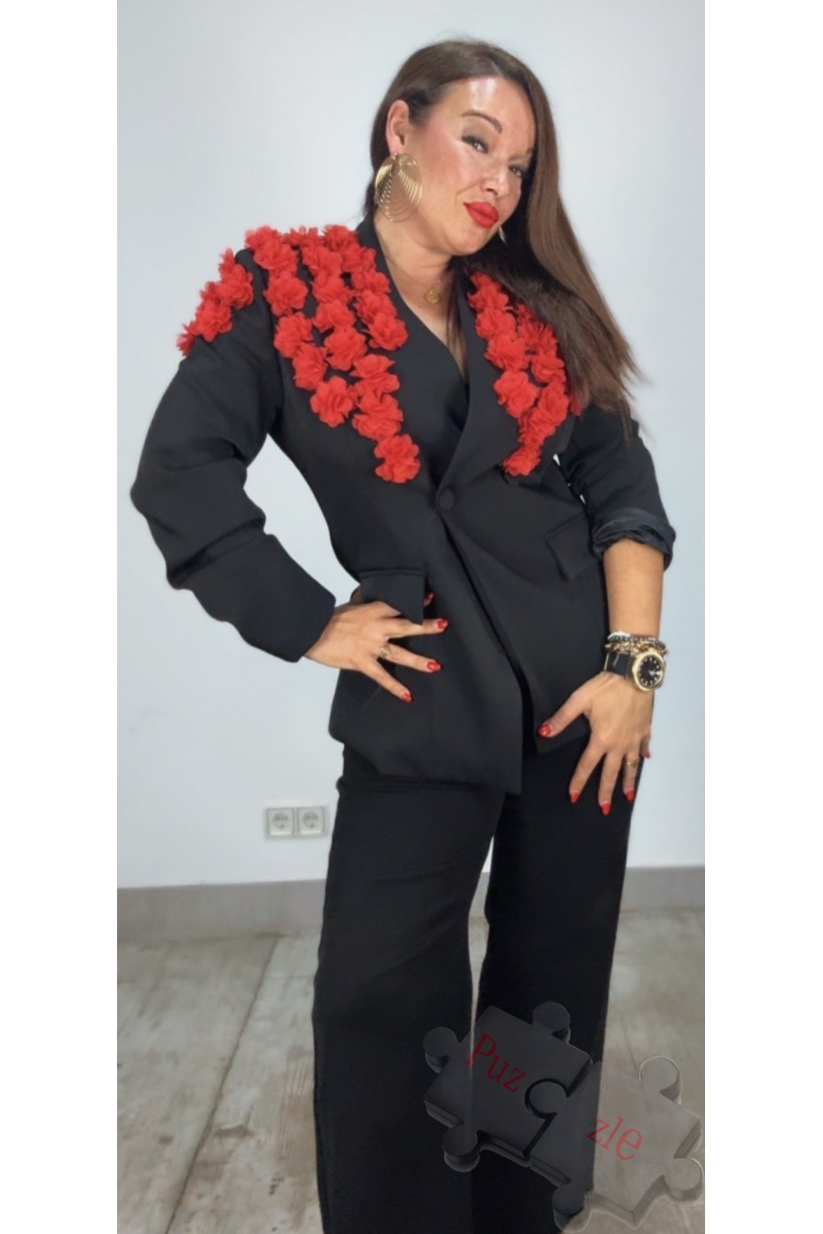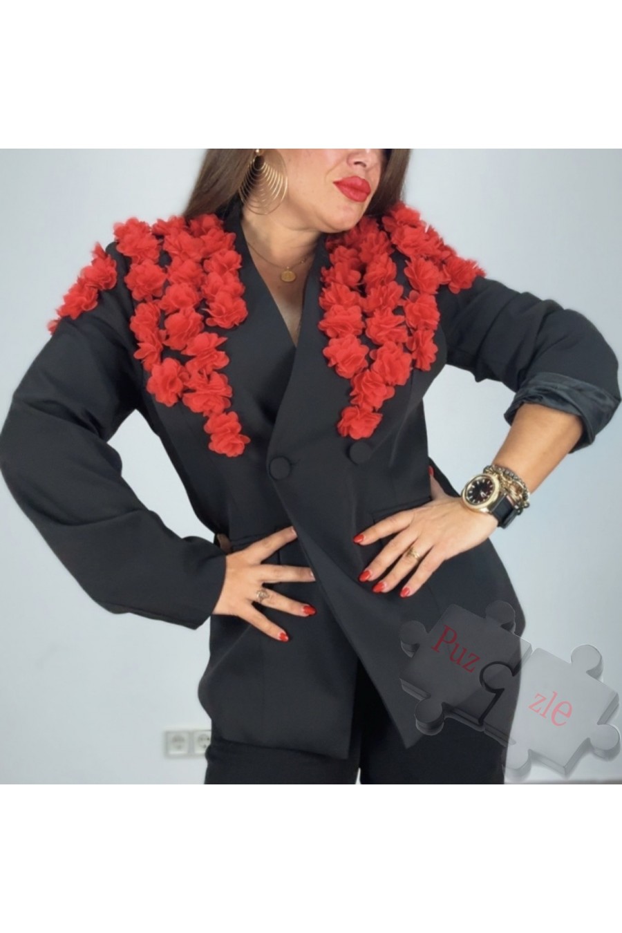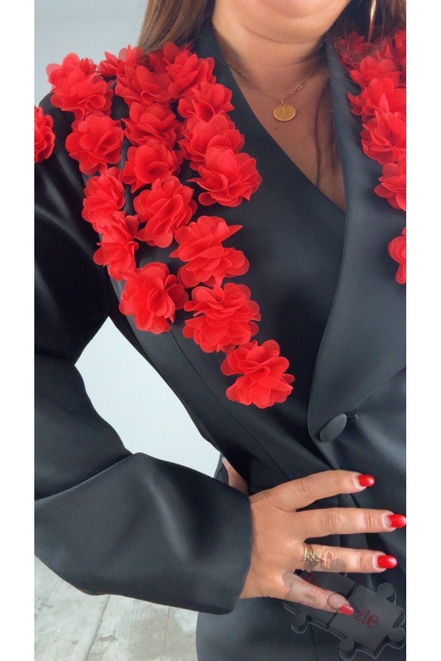 Chaqueta en tono negro con rosas de tul en rojo , disponible en talla única