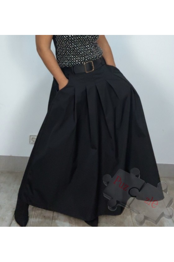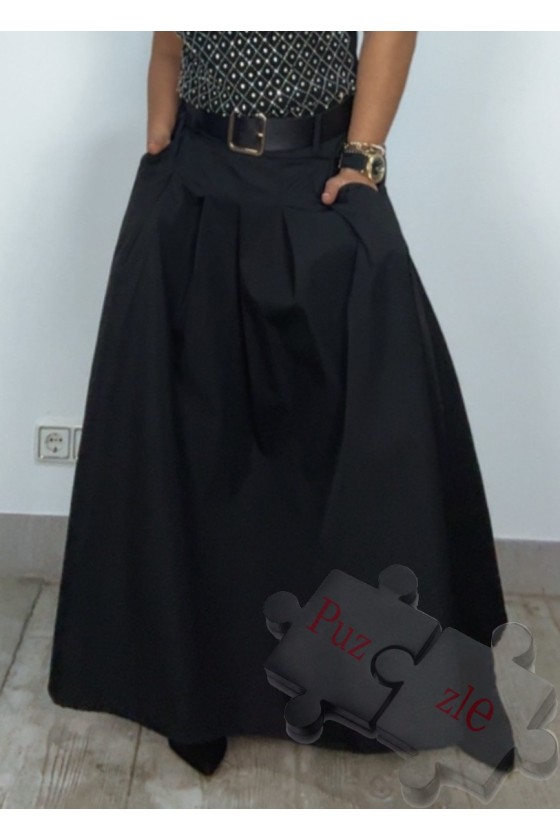 Falda de tafetán en tono negro , lleva bolsillos y cintura elástica trasera , disponible en talla única