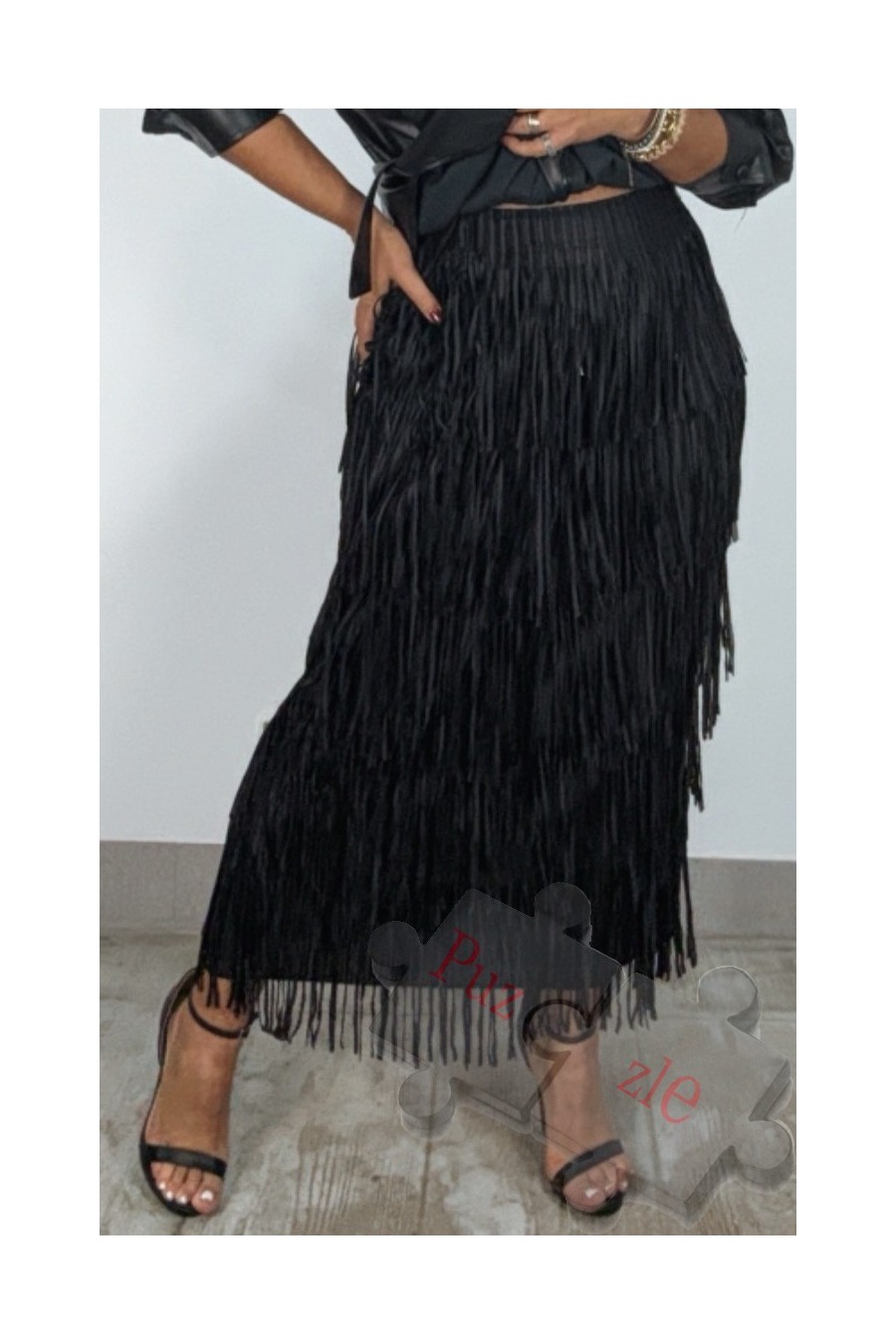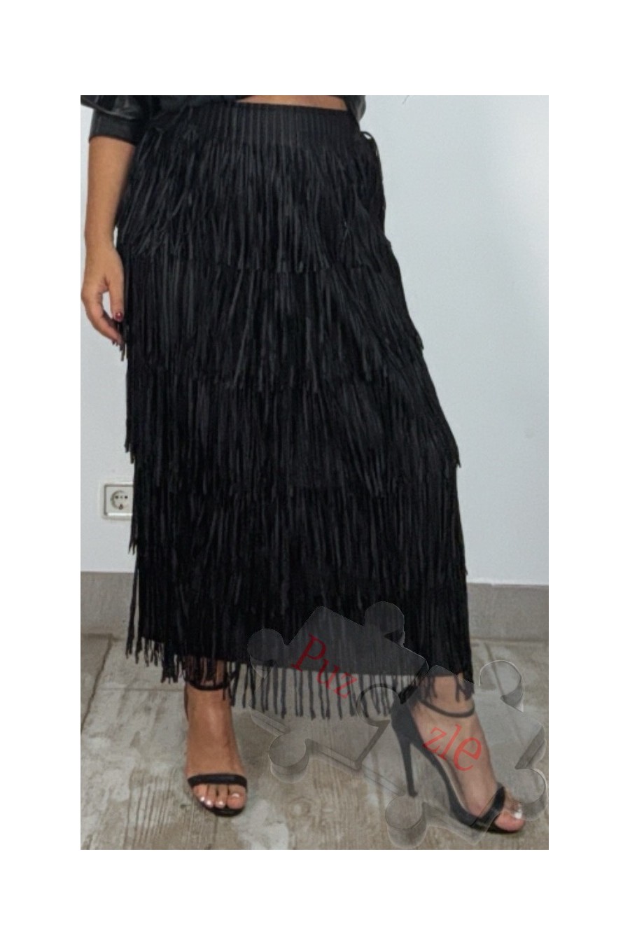 Falda de flecos en tono negro , disponible en talla única