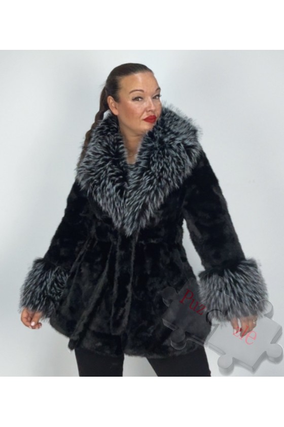 Abrigo de polipiel en tono negro con cuello y puños de pelo natural de zorro , disponible en talla única