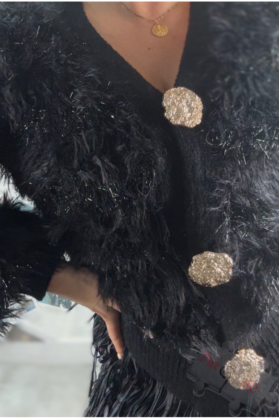 Chaqueta en tono negro con brillo y maxibotones, disponible en talla única , lleva elastano
