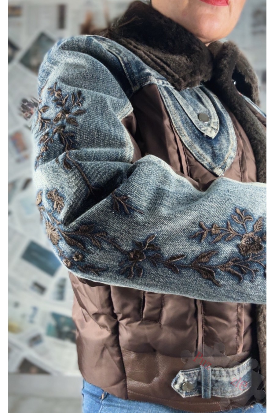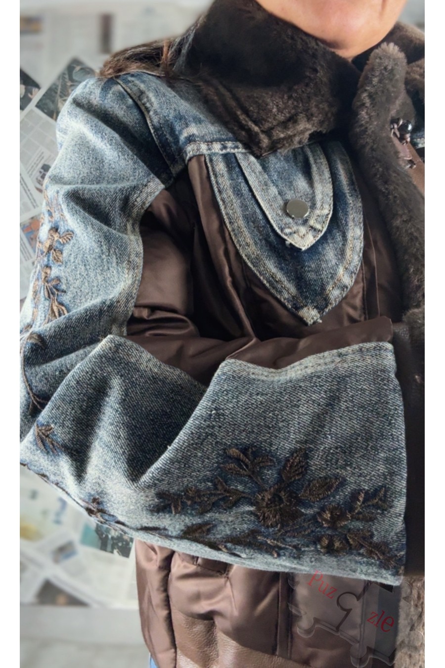 Abrigo de pluma de oca en tono marrón combinado con vaquero bordado, disponible en talla única