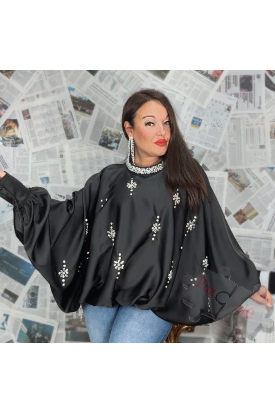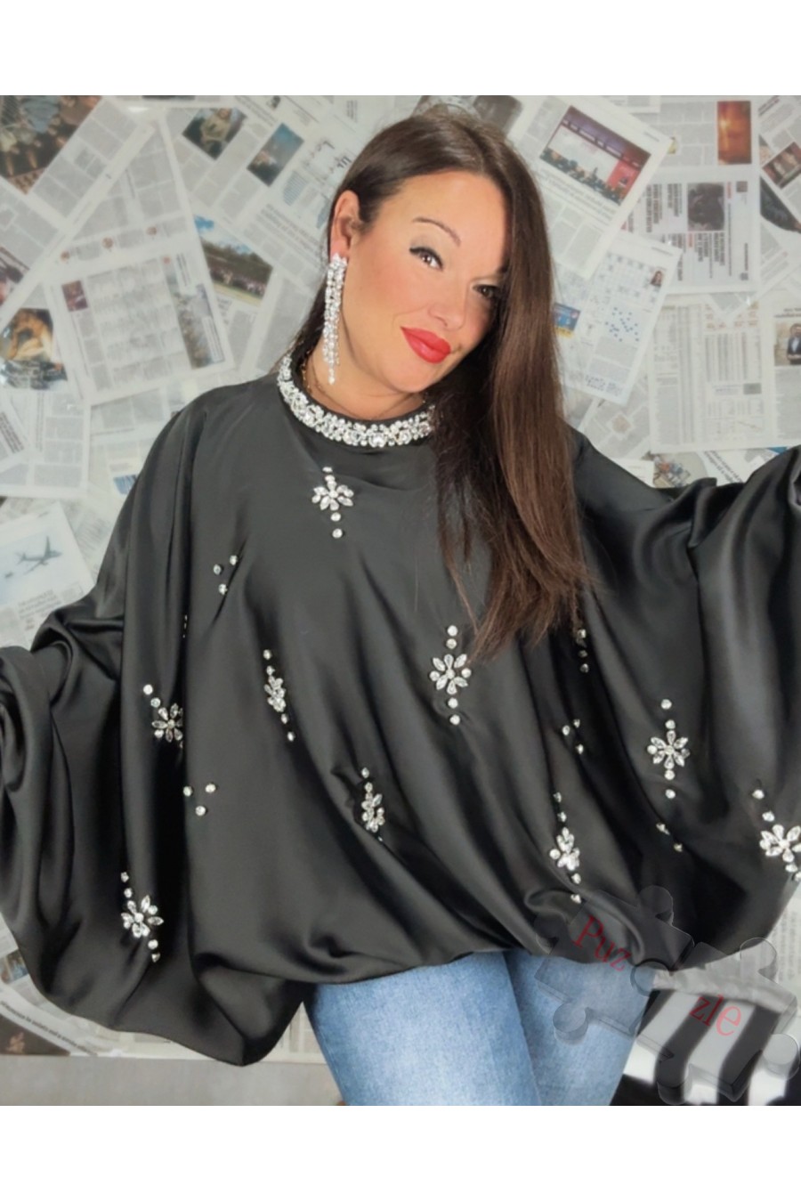 Blusón de satén con pedrería , disponible en talla única