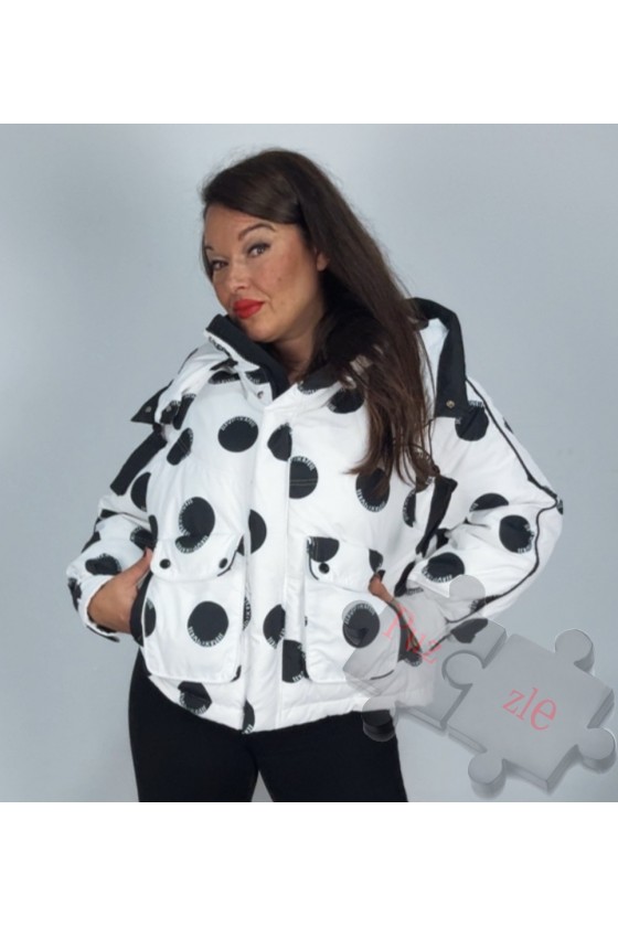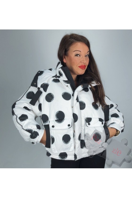 Abrigo de pluma de oca en blanco con lunar en negro, lleva gorro pero se desmonta, disponible en talla única