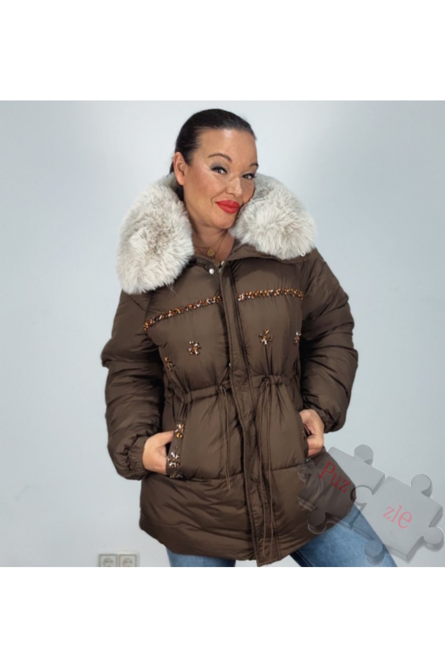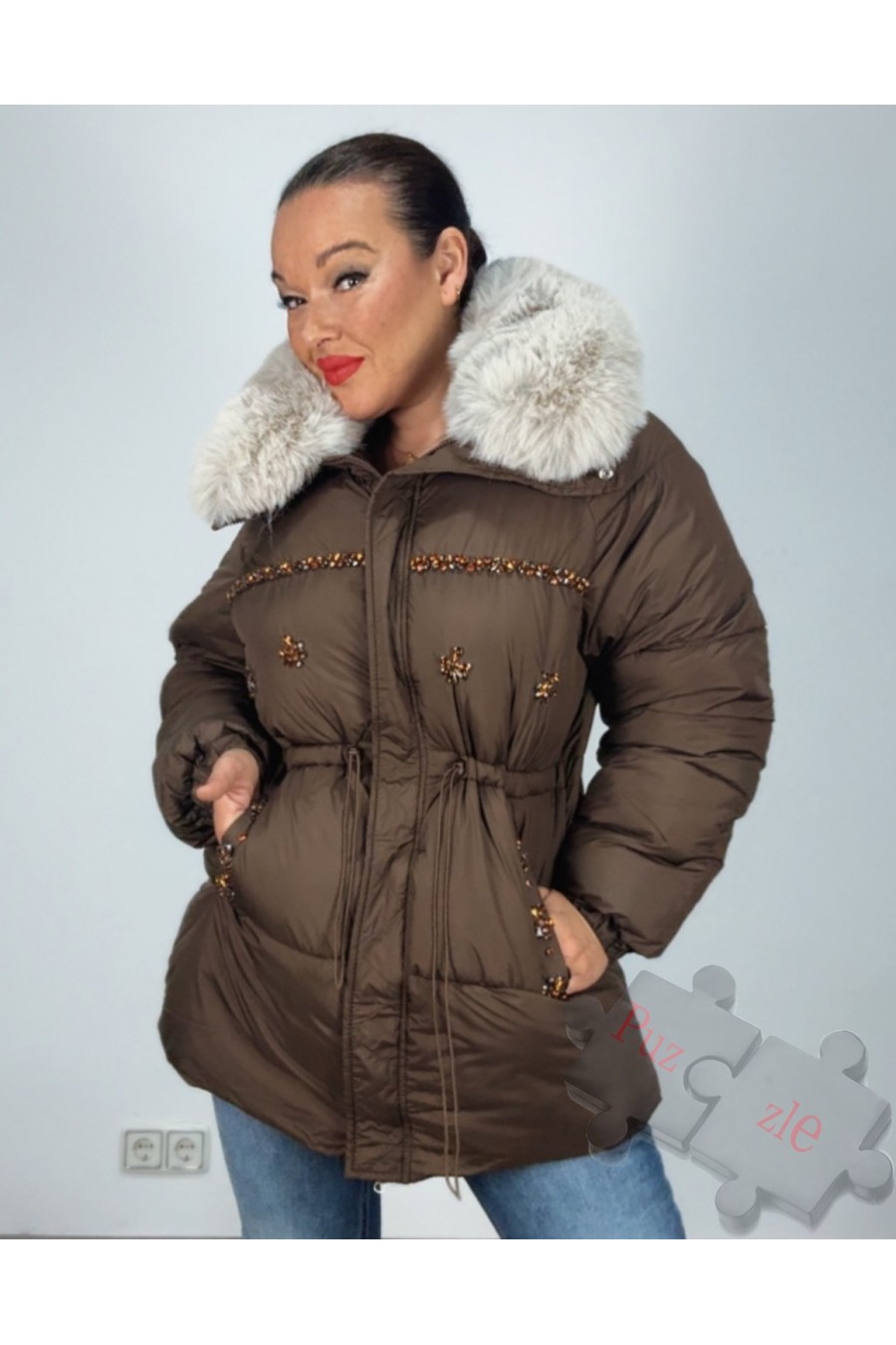 Abrigo joya en tono chocolate , el cuello se desmonta , disponible en tallas