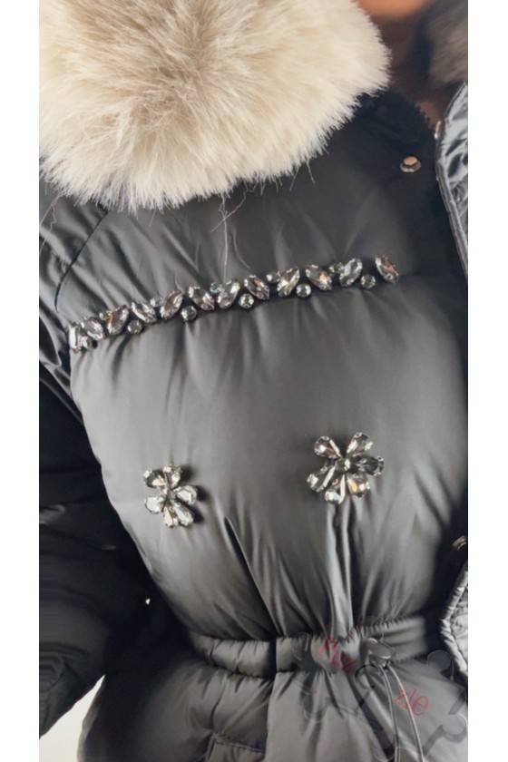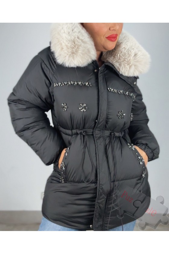 Abrigo en tono negro joya , cuello desmontable, disponible en dos tallas