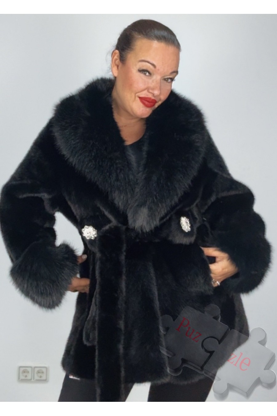 Abrigo de pelo en tono negro con broche en cintura , disponible en talla única