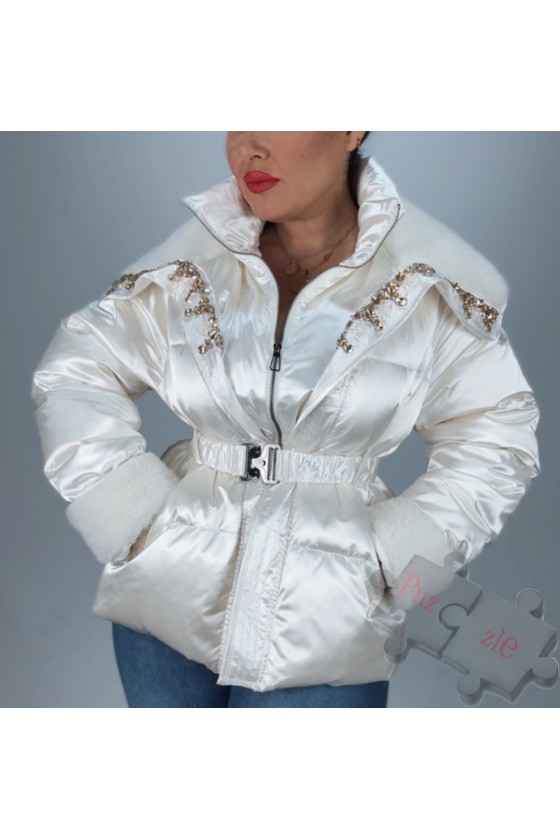 Abrigo de pluma de oca en tono marrón combinado con vaquero bordado, disponible en talla única