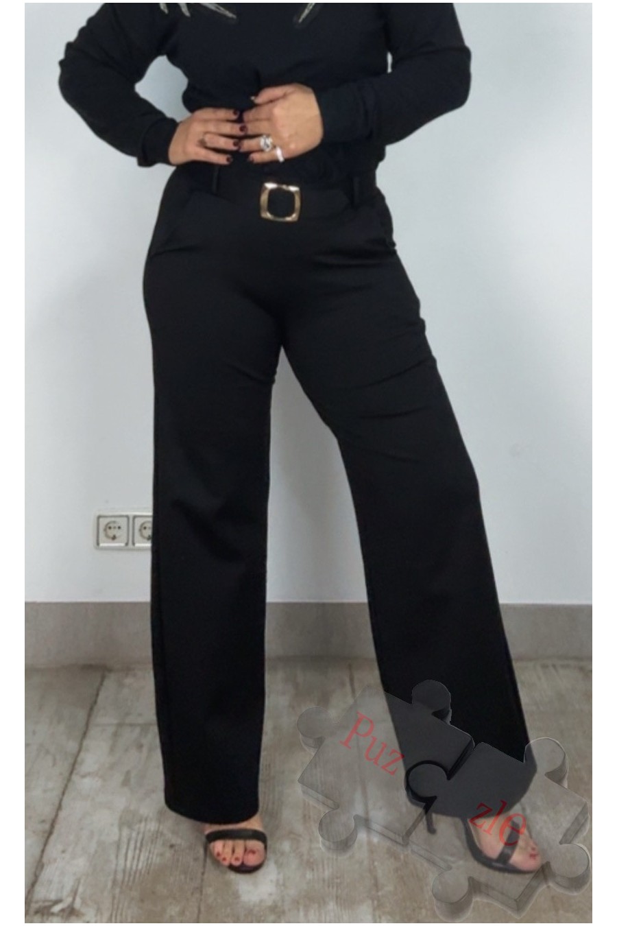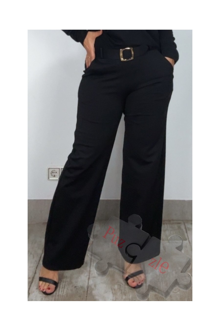 Pantalón en tono negro con cinturón, disponible en tallas