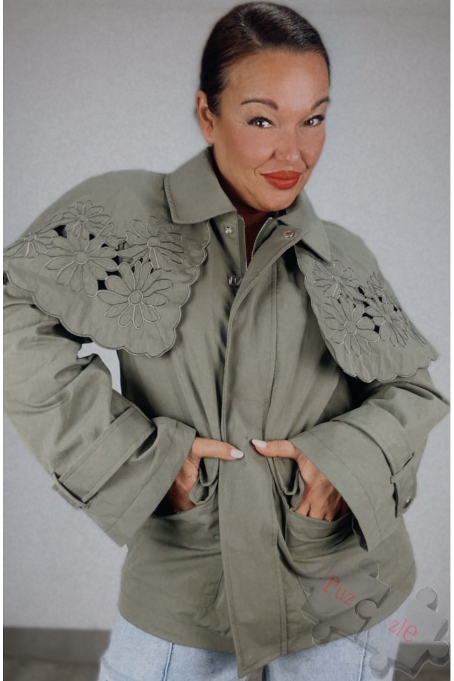 Gabardina en tono verde con baberola , disponible en talla única