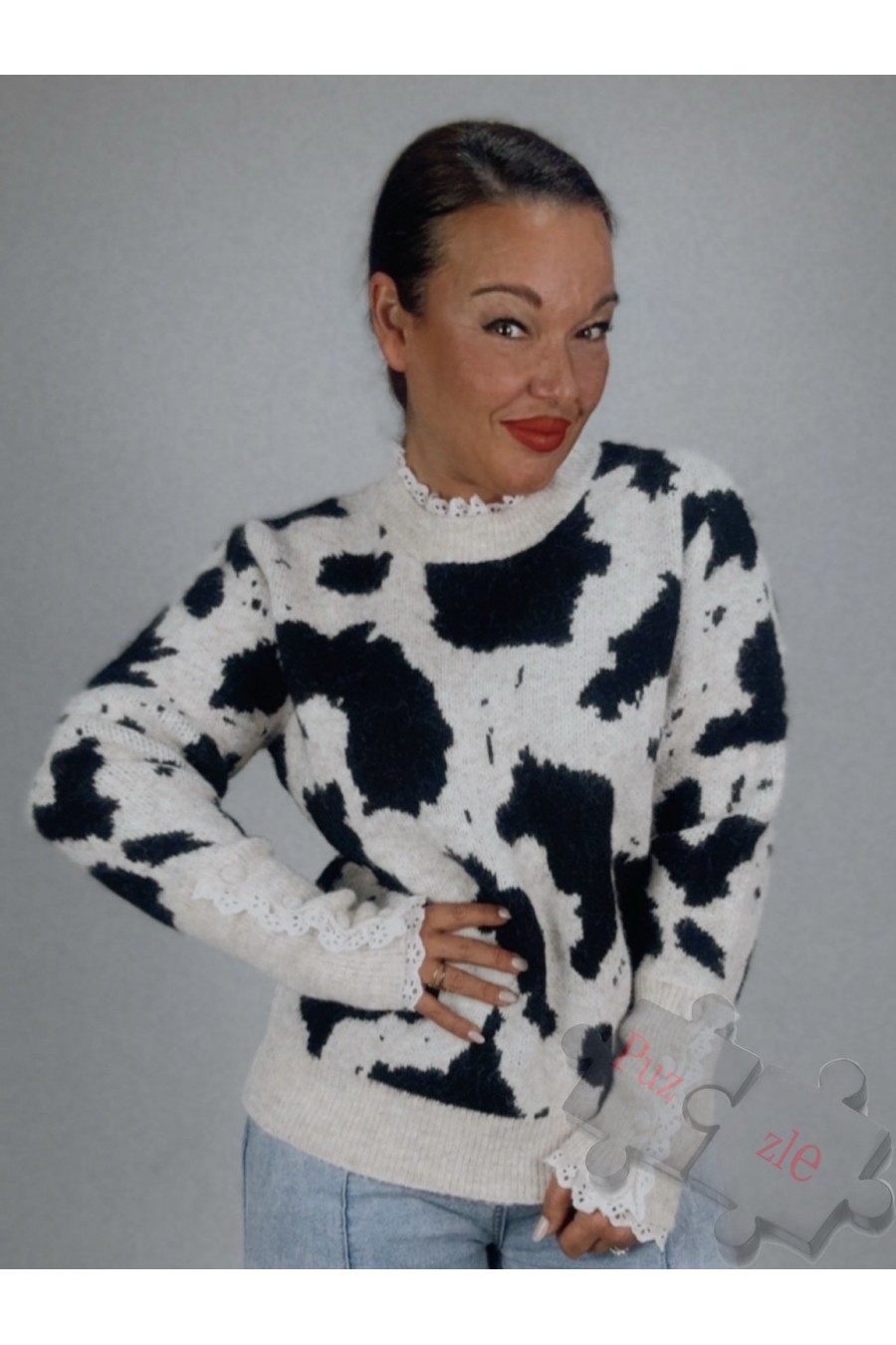Suéter de lana con puntilla en mangas y cuello , disponible en talla única
