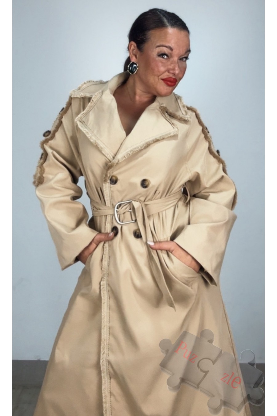 Gabardina en tono beig con detalles desflecados, disponible en talla única