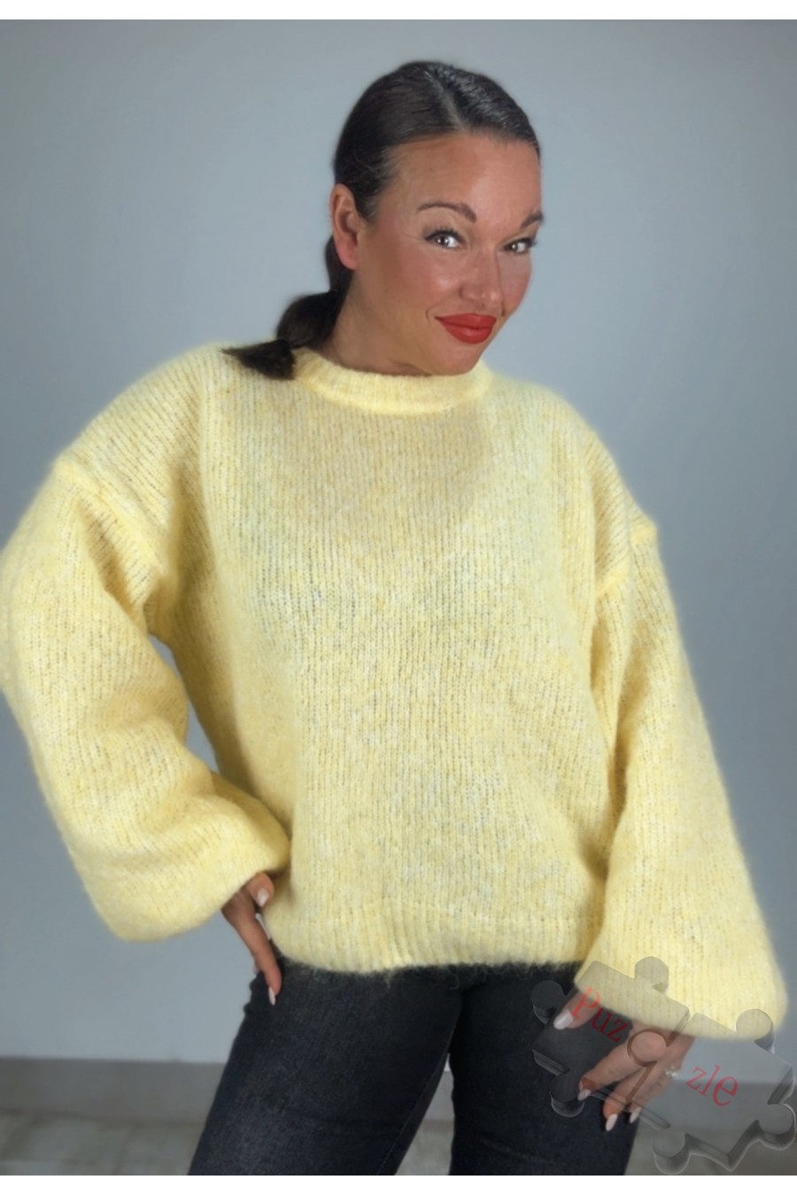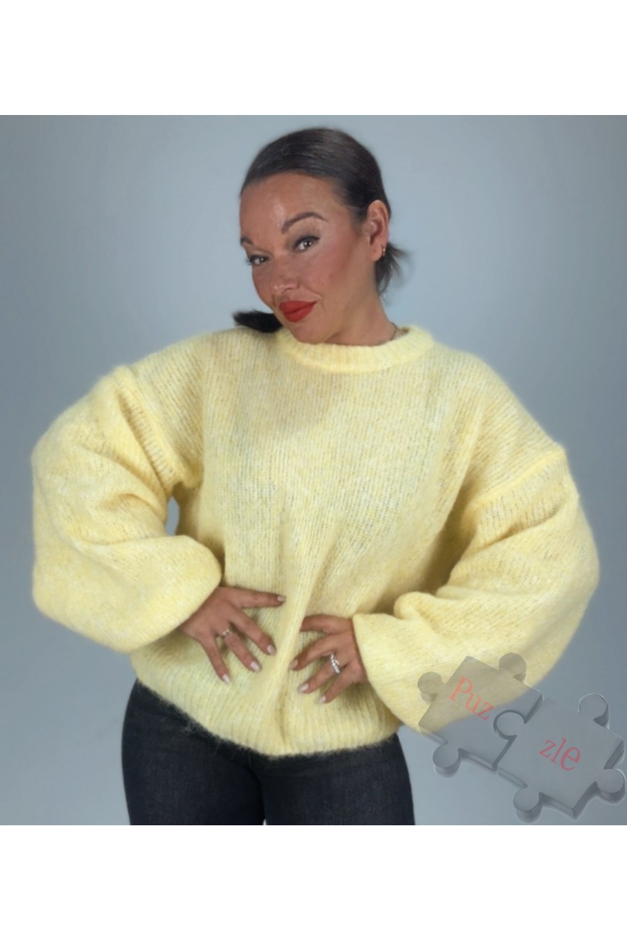 Suéter de lana en tono amarillo con mangas abullonadas, disponible en talla única