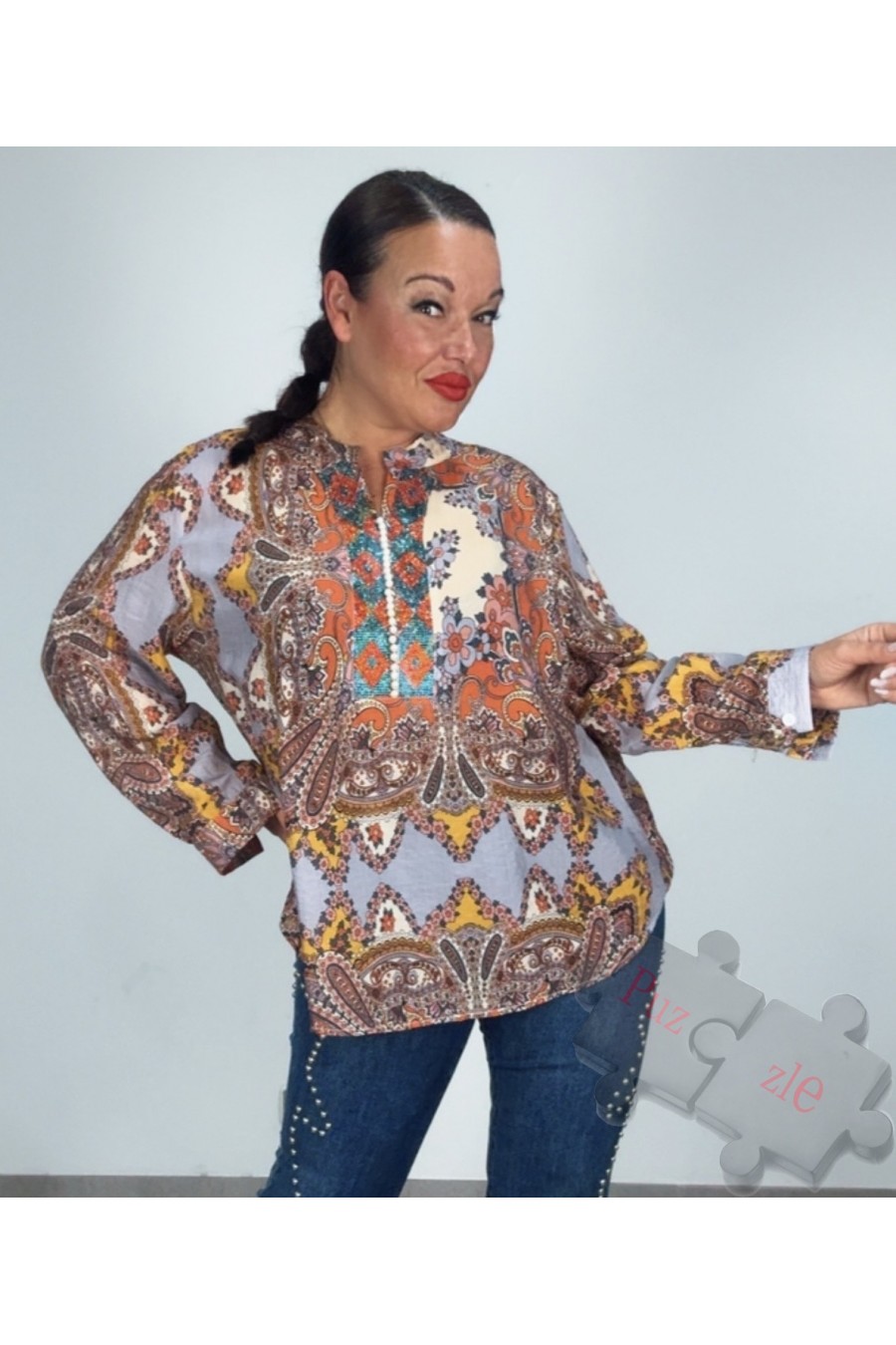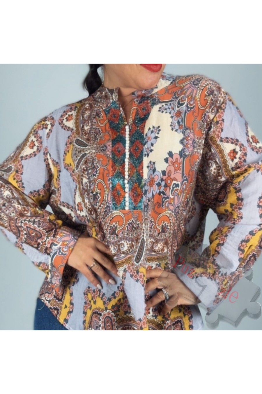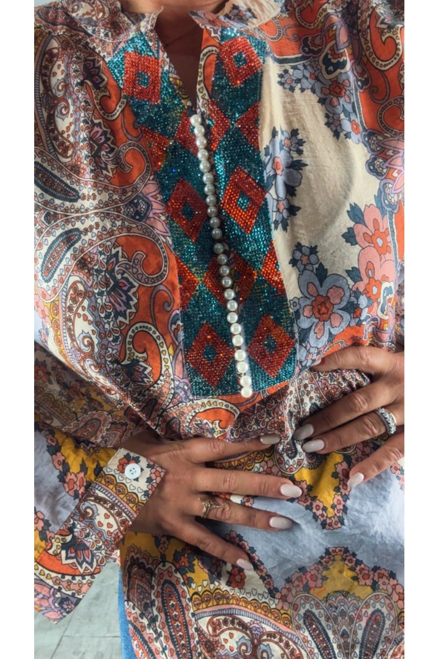 Camisa estampada con detalles en perla en la parte delantera , disponible en talla única