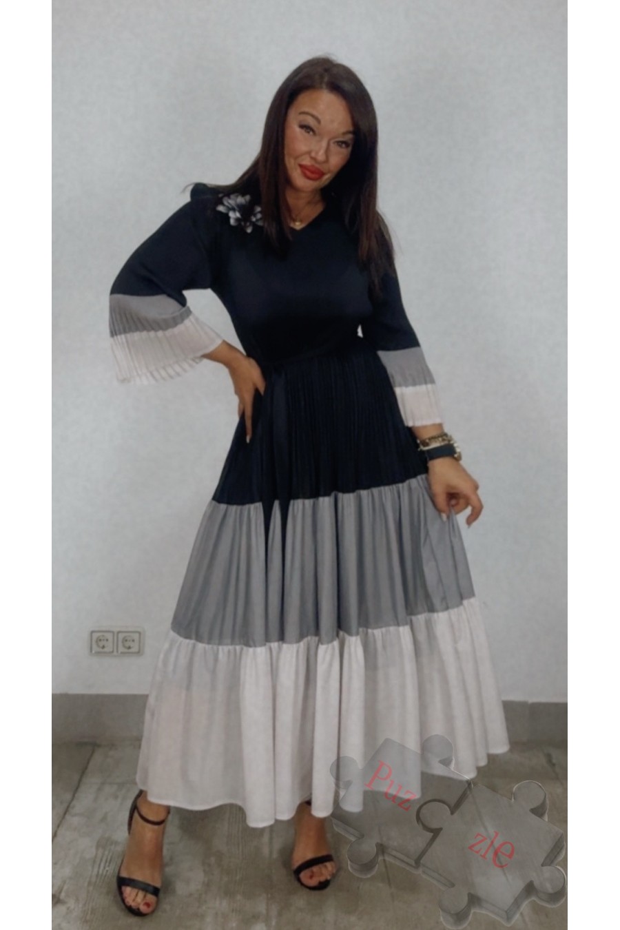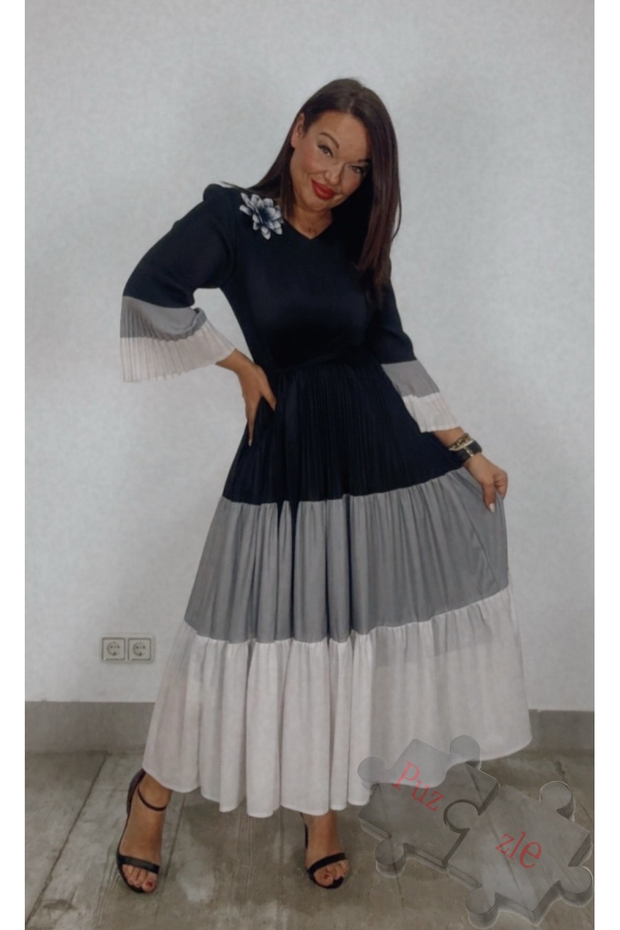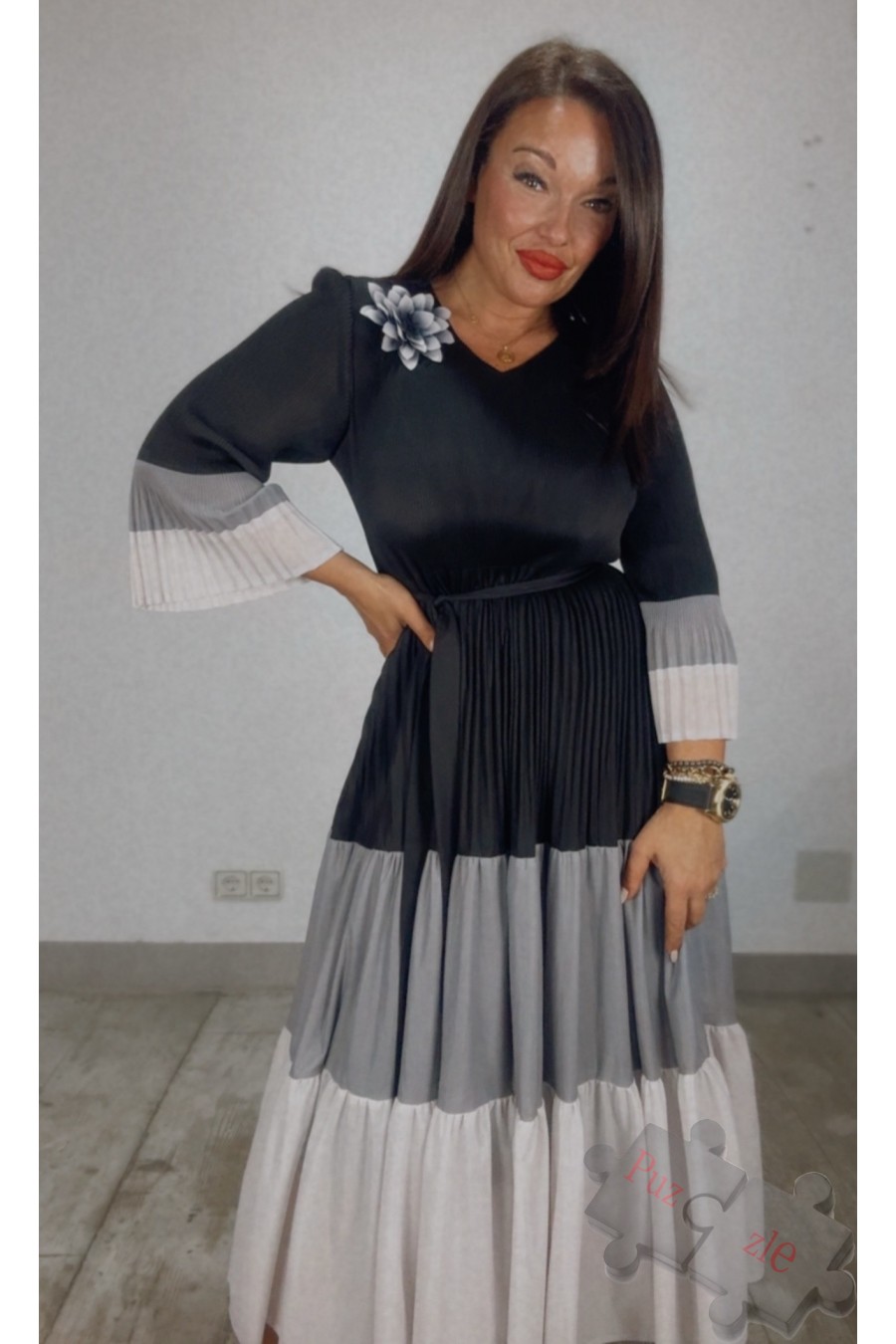Vestido de tejido acordeón en tonos negros , disponible en talla única
