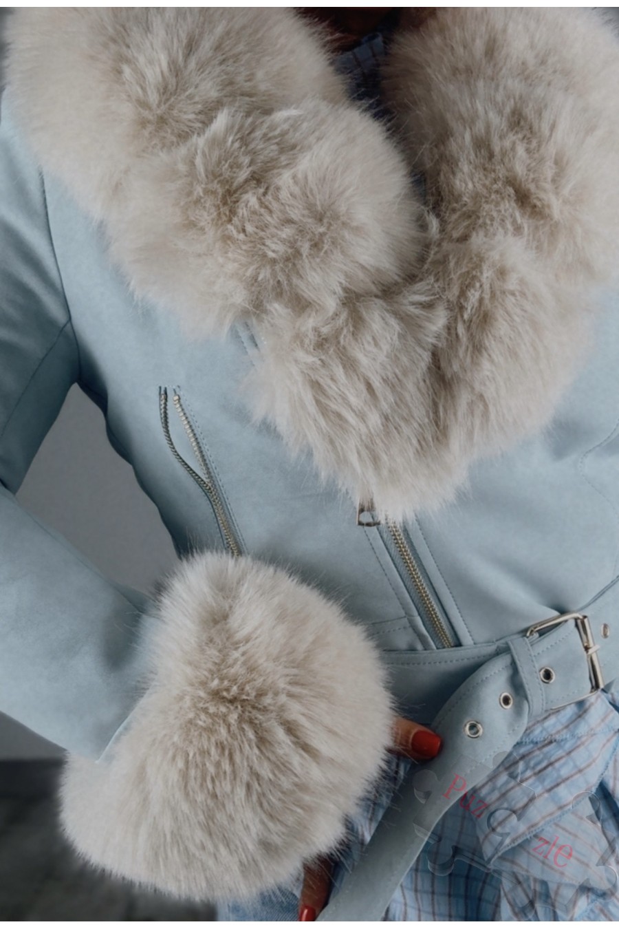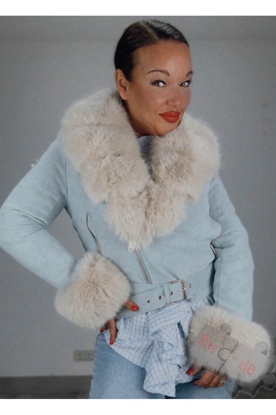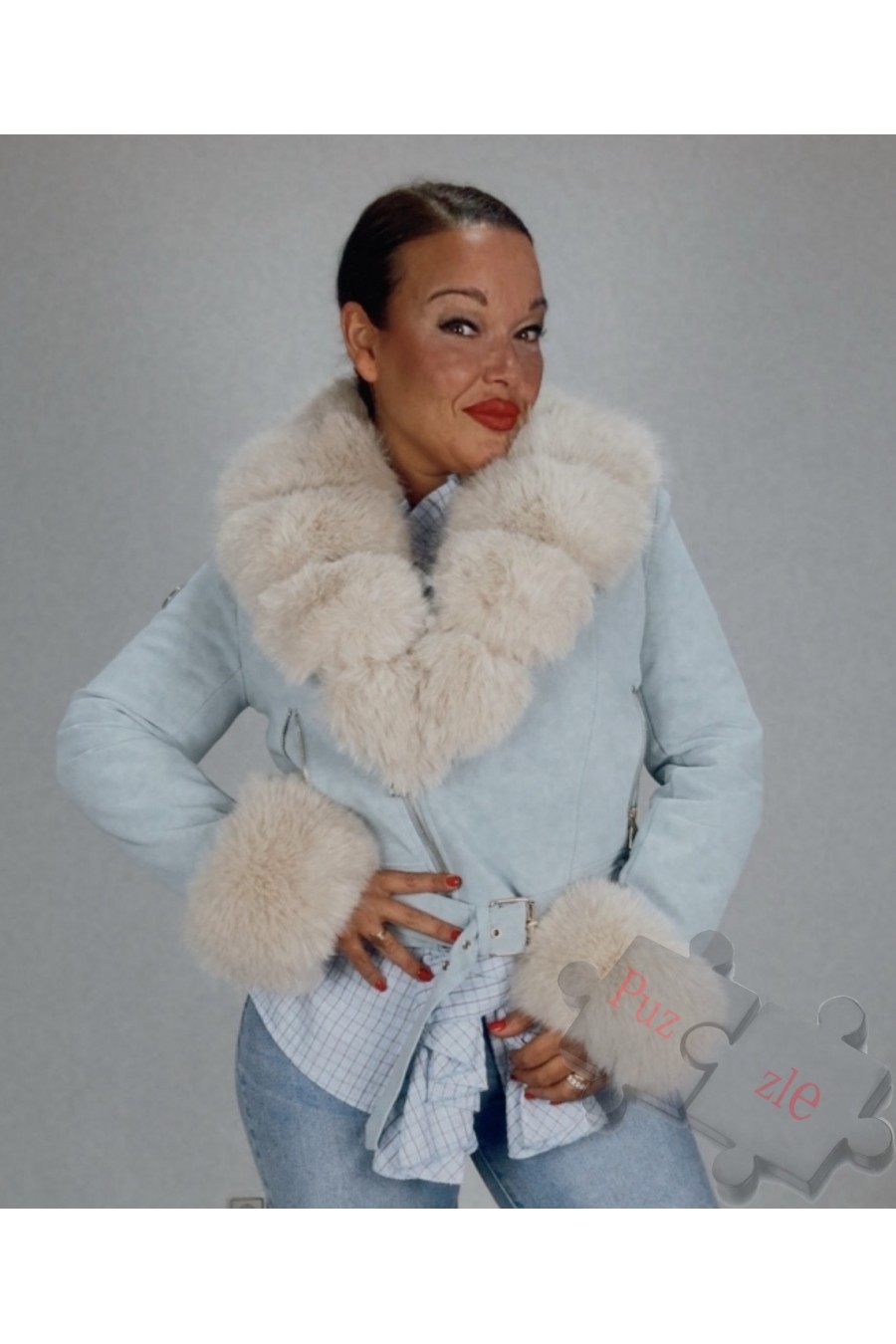 Chaqueta de polipiel en tono azul cielo con pelo en el interior , disponible en tres tallas , cuello y mangas desmontable
