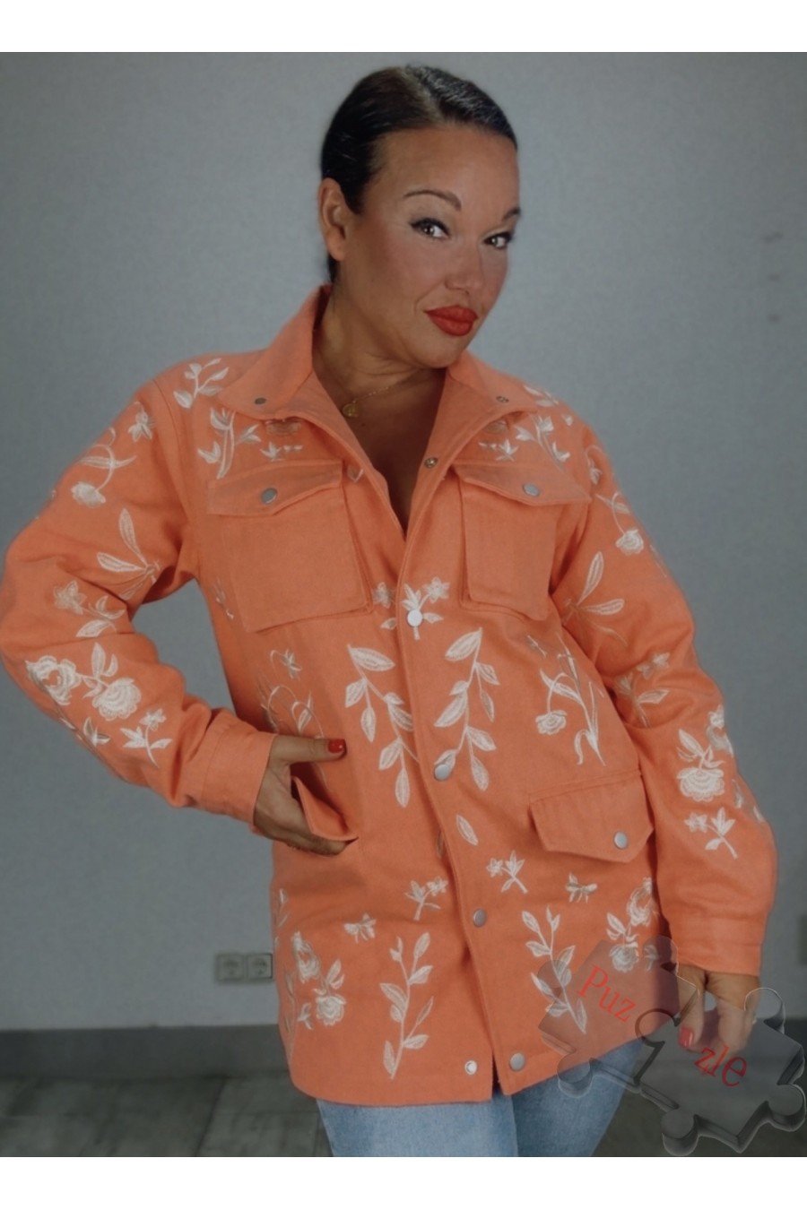 Parka en tono coral con bordados en crudo , disponible en tres tallas